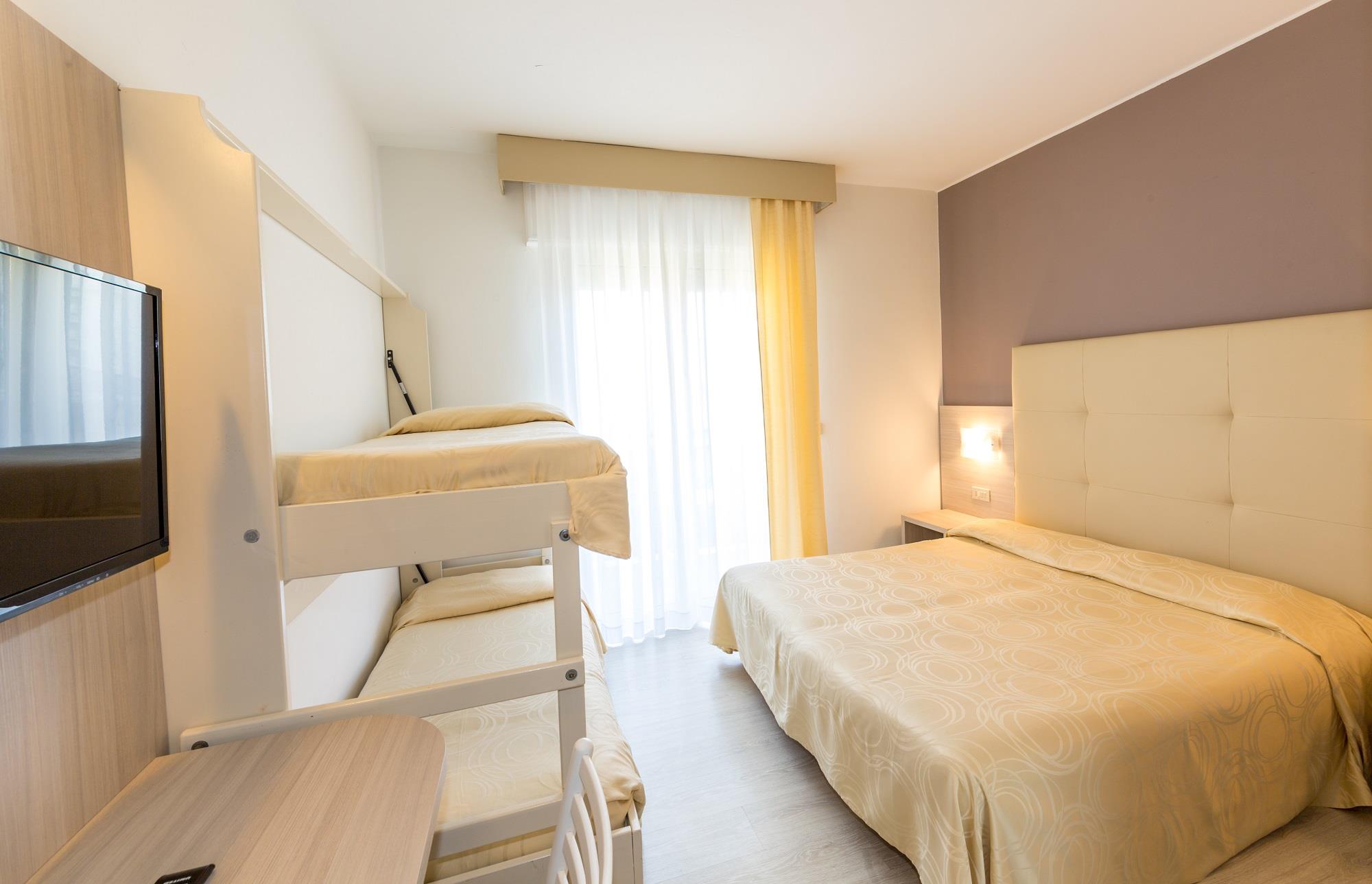 STANDARD max occupancy 4 pax: Le nostre camere vi accoglieranno con i colori tenui della sabbia, con un arredamento sobrio, ma decisamente moderno e funzionale. Potete scegliere se prenotare due letti separati oppure un letto matrimoniale, ma sempre e comunque le camere sono dotate di ampio balcone, tapparelle elettriche, servizi privati con asciugacapelli, paravento doccia in cristallo, set di cortesia, aria condizionata (a pagamento), telefono diretto, TV LED, minibar, cassetta di sicurezza e WiFi.