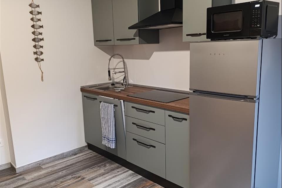 La cucina completamente attrezzata ti permette di sentirti come a casa: piano cottura ad induzione, forno, microonde, stoviglie e tutto il necessario per cucinare in libertà.
