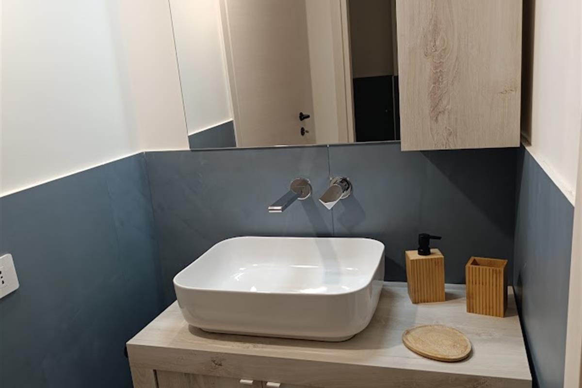 Il bagno, spazioso e moderno, è dotato di una grande doccia.