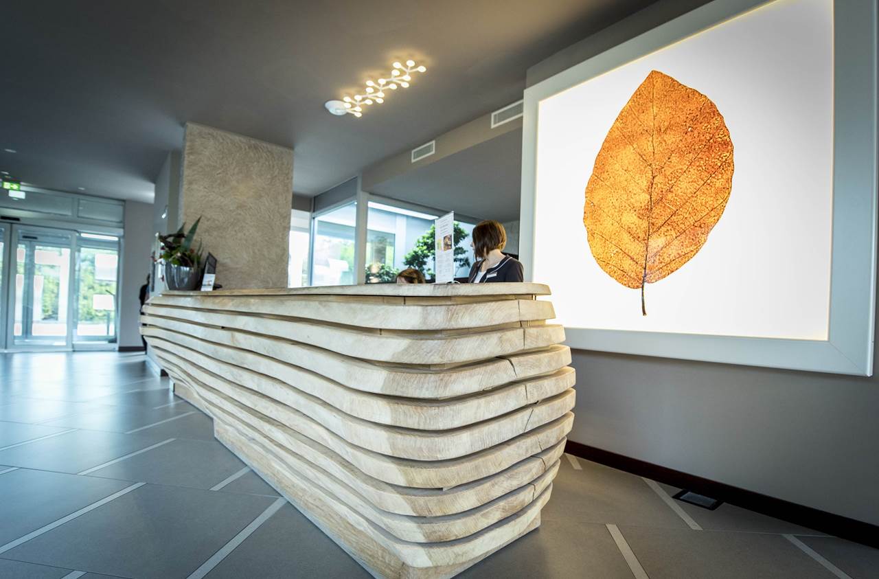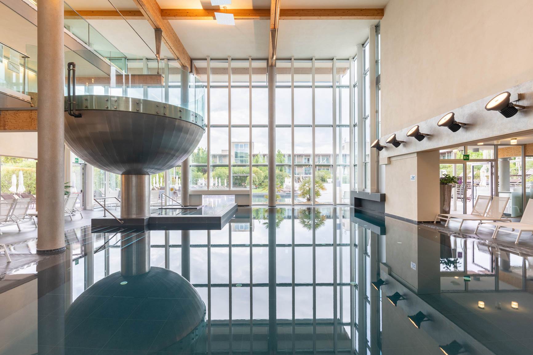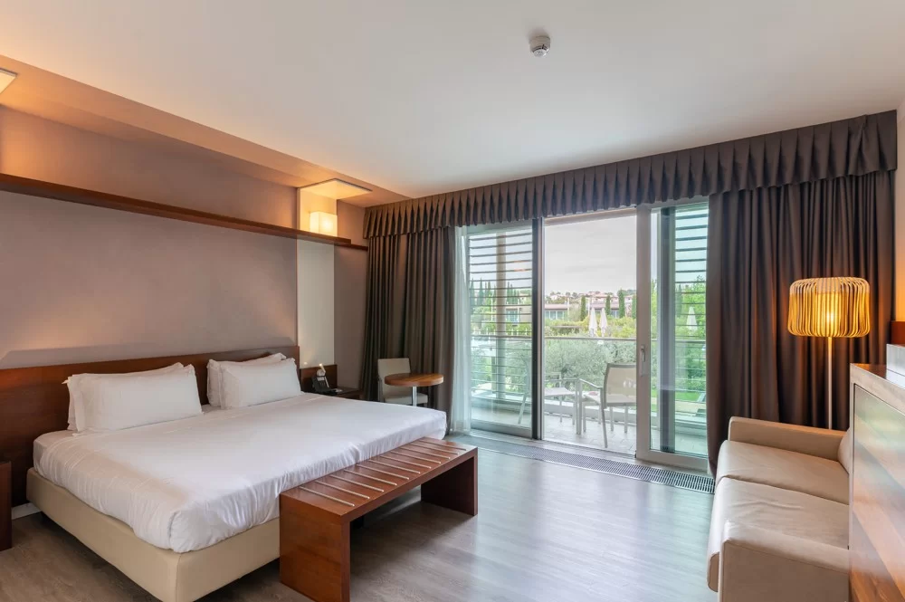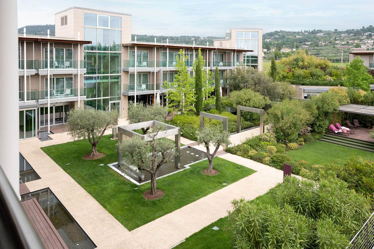 È la prima struttura sul Lago di Garda a ottenere la certificazione ClimaHotel. La sua architettura a forma quadrata si fonde armoniosamente con l’ambiente circostante, riducendo l’impatto ambientale. La struttura si estende su una superficie di 17.000 m² e presenta ampie vetrate che offrono una vista spettacolare sul cortile e sull’area acquatica, creando un’atmosfera luminosa e accogliente.