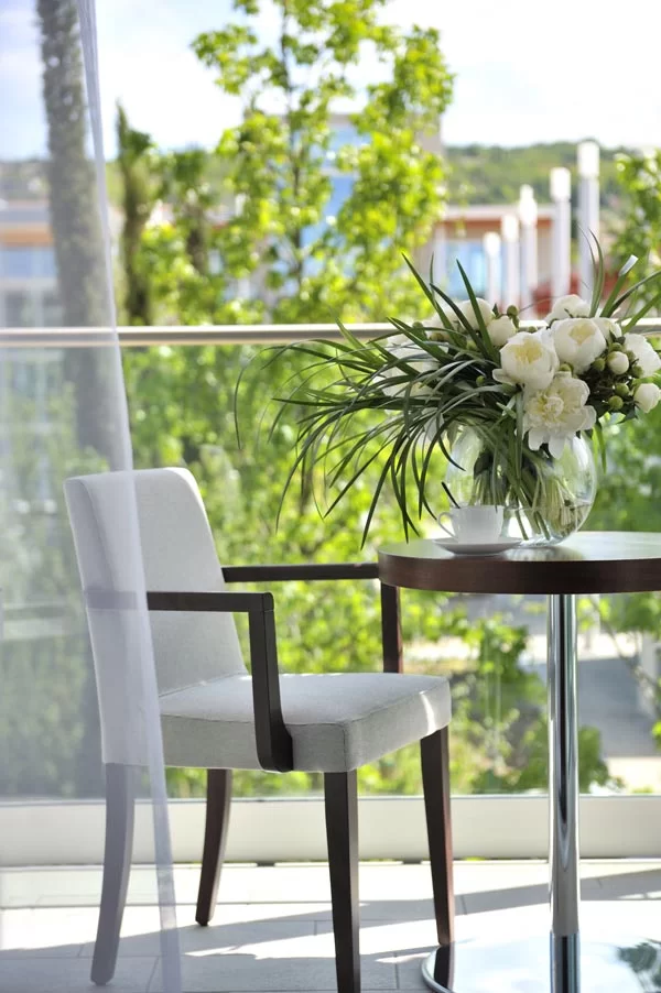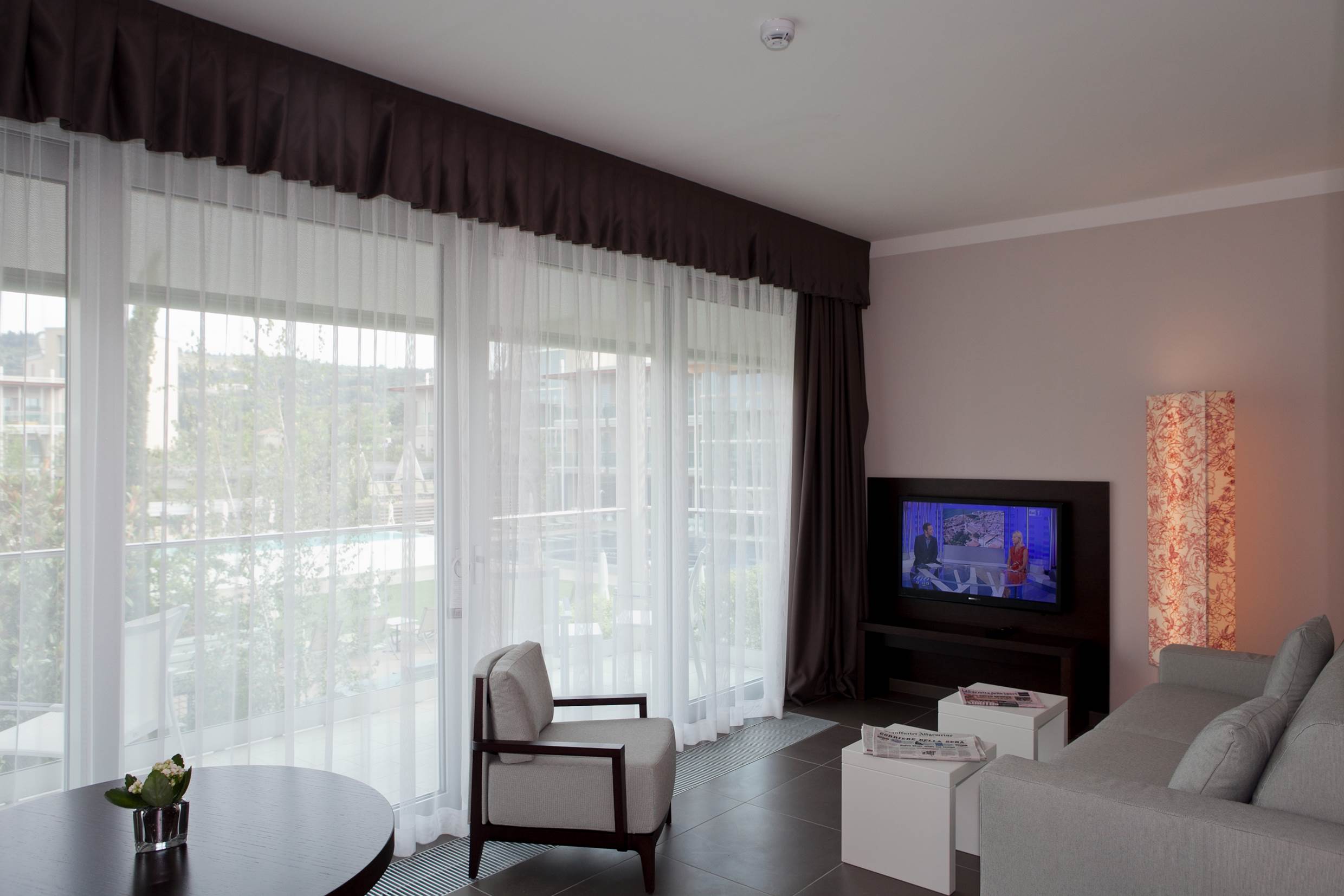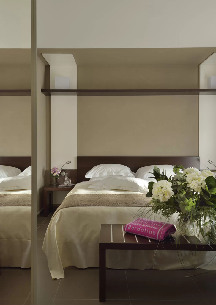 R4 Garden Suite: Le Garden Suite sono collocate al piano terra e al primo piano della zona “Villette”. Raffinata camera ampia con salotto separato e abitabile, ambienti dai colori caldi e avvolgenti che richiamano le tonalità della terra e della natura. Spazi illuminati da una grande vetrata che si apre su un ampio balcone attrezzato con un comodo salotto. Grazioso giardino o terrazza abitabili arredati con lettini prendi sole. 49mq ca.