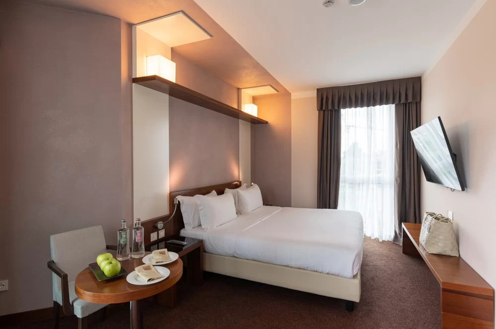 DC4 DB Comfort: Tutte le camere sono ubicate al primo e secondo piano della struttura. Le camere Comfort si trovano lungo il perimetro esterno e si affacciano sulla zona abitata circostante. 20-24 mq ca.