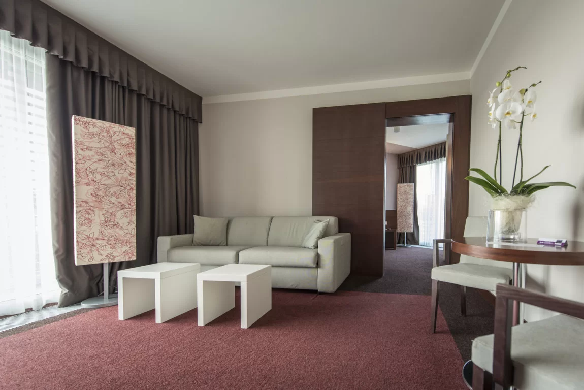 F4 Family Suite: Camera ampia ubicata sul perimetro esterno o interno della struttura con salotto separato con divano letto. Spazi illuminati da una grande vetrata che si apre su un ampio balcone attrezzato. 44mq ca.