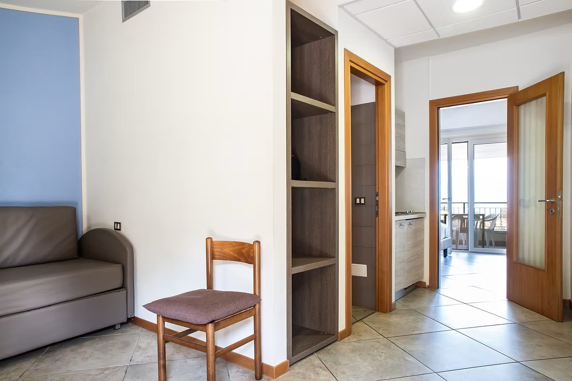 BILO Bilocale: ca. 22 mq. I bilocali sono dotati di doccia, asciugacapelli, TV satellitare, cassaforte, frigo, aria condizionata, internet Wi-Fi e balcone. Tutti gli appartamenti sono composti da un angolo cottura con due piastre elettriche, frigo piccolo e bollitore. , piccola zona soggiorno con divano letto doppio a castello, camera da letto con letto matrimoniale, balcone.La quota comprende