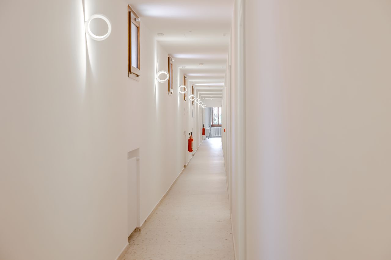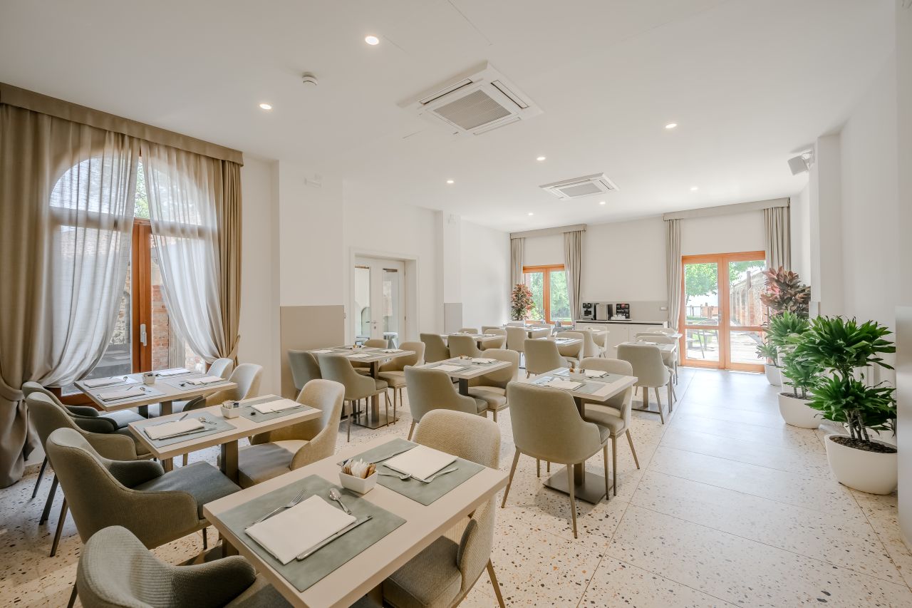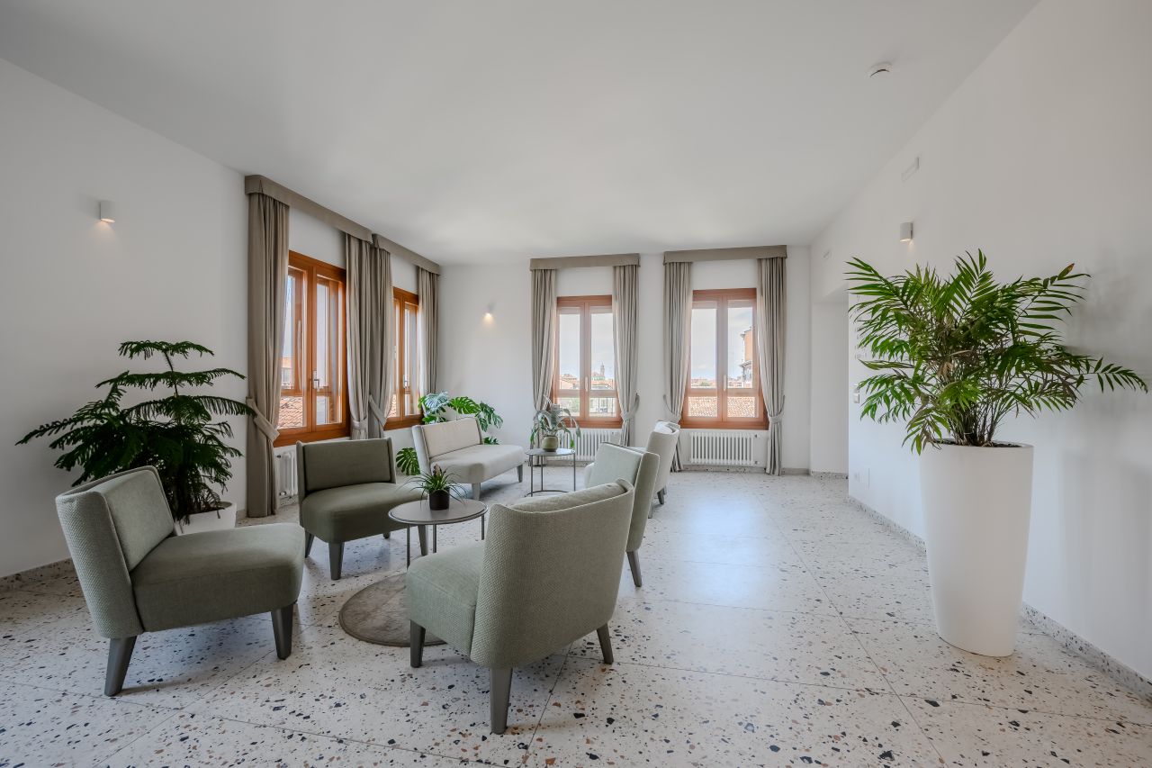 Le camere, situate al primo e secondo piano sono 28, mentre al piano terra se ne trovano altre 7, tutte dotate di bagno privato con doccia e di un’accogliente zona soggiorno. Ogni stanza offre una vista esclusiva sugli orti e i giardini del convento ed è arredata con grande cura, combinando il comfort moderno con l’atmosfera tipicamente veneziana. I pavimenti sono realizzati in moderno seminato veneziano, mentre i bagni si distinguono per eleganza e attenzione ai dettagli. I materiali utilizzati si armonizzano con gli arredi, che includono un comodo letto matrimoniale, una scrivania, un divano dalle linee classiche ma contemporanee e armadi dal design moderno ed essenziale. Queste camere non sono semplici “punti di appoggio”, ma veri e propri spazi da vivere, che diventano parte fondamentale dell’esperienza del soggiorno.Amici a 4 Zampe