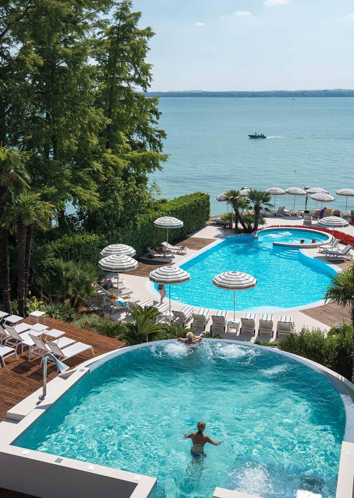a pranzo possibilità di ordinare dalla piccola carte dell'albergo (con pagamento diretto). In caso di prenotazioni in mezza pensione non è possibile intercambiare il servizio di mezza pensione con il pranzo (mezza pensione prevista solo la cena). Piscina esterna (18x6) con acqua dolce, aperta tutta la stagione (non acqua termale) Piscina esterna (6x6) con acqua salata e riscaldata 35° (non acqua termale) Zona wellness e piscina: vietato ingresso ai minori di 16 anni. Area benessere con sauna, bagno turco, docce emozionale, sala relax con parete di sale per iodoterapia. Trattamenti estetici in cabina privata a richiesta. Pontile per attracco e per uso solarium di proprietà dell'albergo Viaggio di nozze: bottiglia di spumante in camera Sirmione è diventata zona ZTL e non è possibile circolare con le auto. Parcheggio garantito in hotel fino ad esaurimento posti a pagamento. Poi verrà utilizzato il parcheggio esterno al castello, Grifo Parking, a pagamento e con servizio di macchine elettriche per il trasporto dei clienti e loro bagagli fino all'hotel. Wi-fi gratuito nelle aree comuni e nelle camere In estate è possibile fare colazione in terrazza (secondo condizioni climatiche) Animali domestici su richiesta, a pagamento Culla disponibile, a pagamento fino a 1,99 anni. Da indicare sulla prenotazione Sporta a pagamento: Tennis e minigolf a circa 1 km, Surf e vela a circa 3 km, campi da golf a circa 20 km. Non adatto per disabili Carte di credito accettate: Visa, Carta Si, MastercardCamere