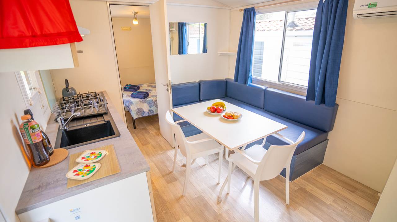 MH Happy PREMIUM: 29mq capienza 6 adulti e 1 bimbo di max 12 anni (dinette), 1 camera matrimoniale (190X140cm) + 2 camere con 2 letti separati (190X70cm), bimbo in aggiunta sulla dinette. 1 bagno completo di doccia, lavandino, wc (in alcune unità wc separato)