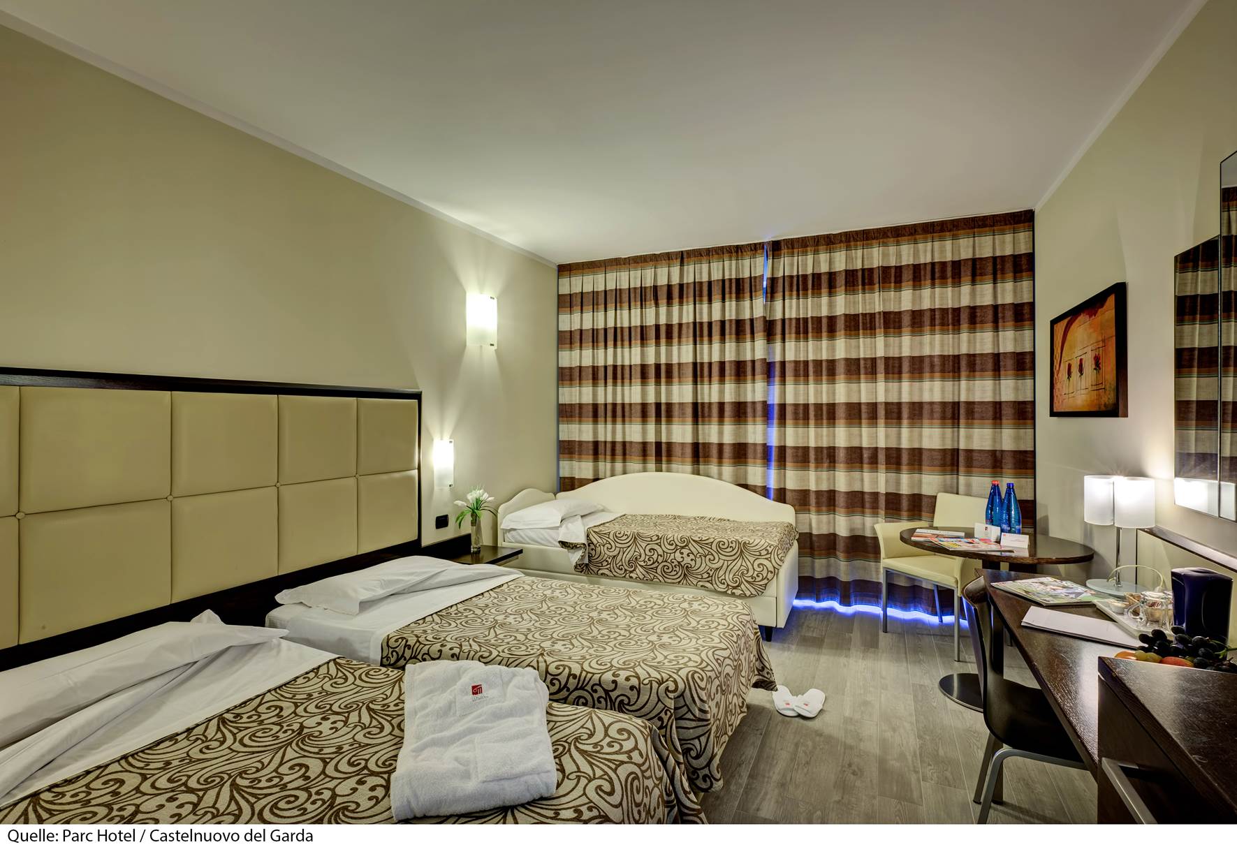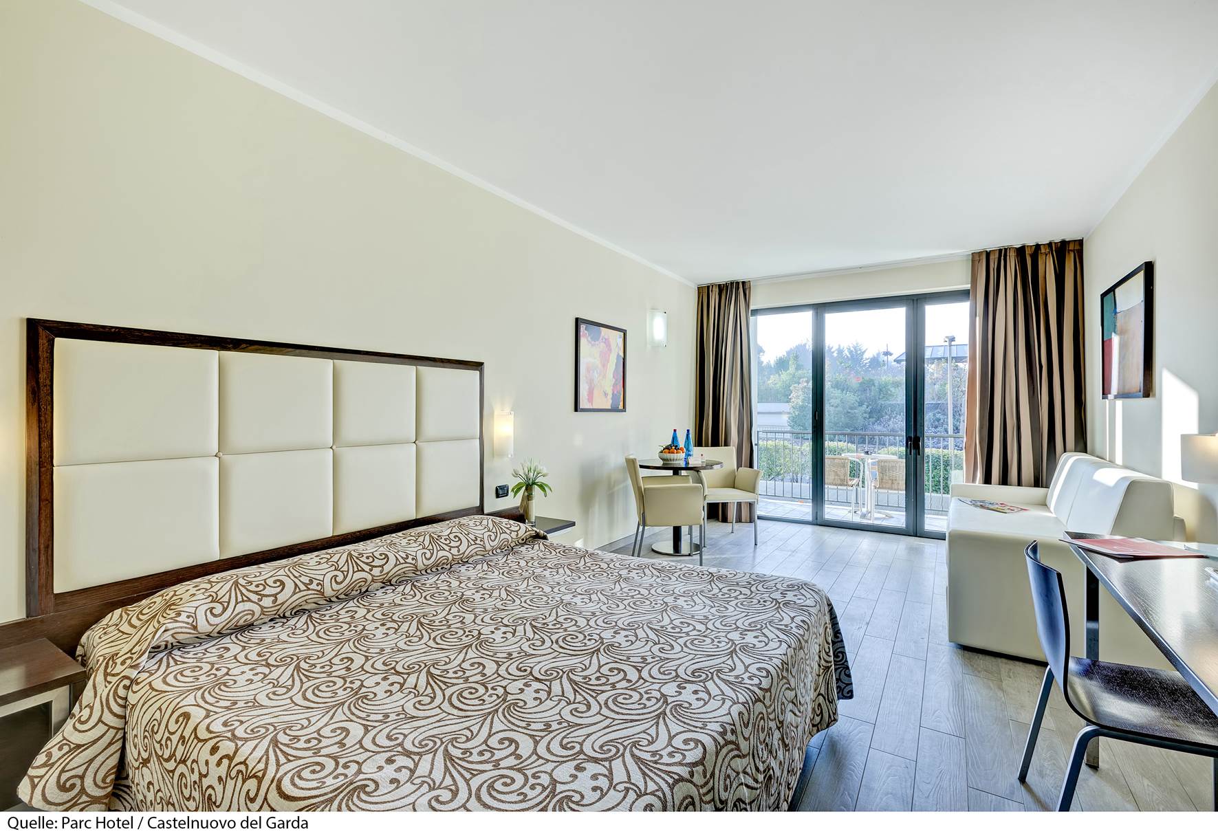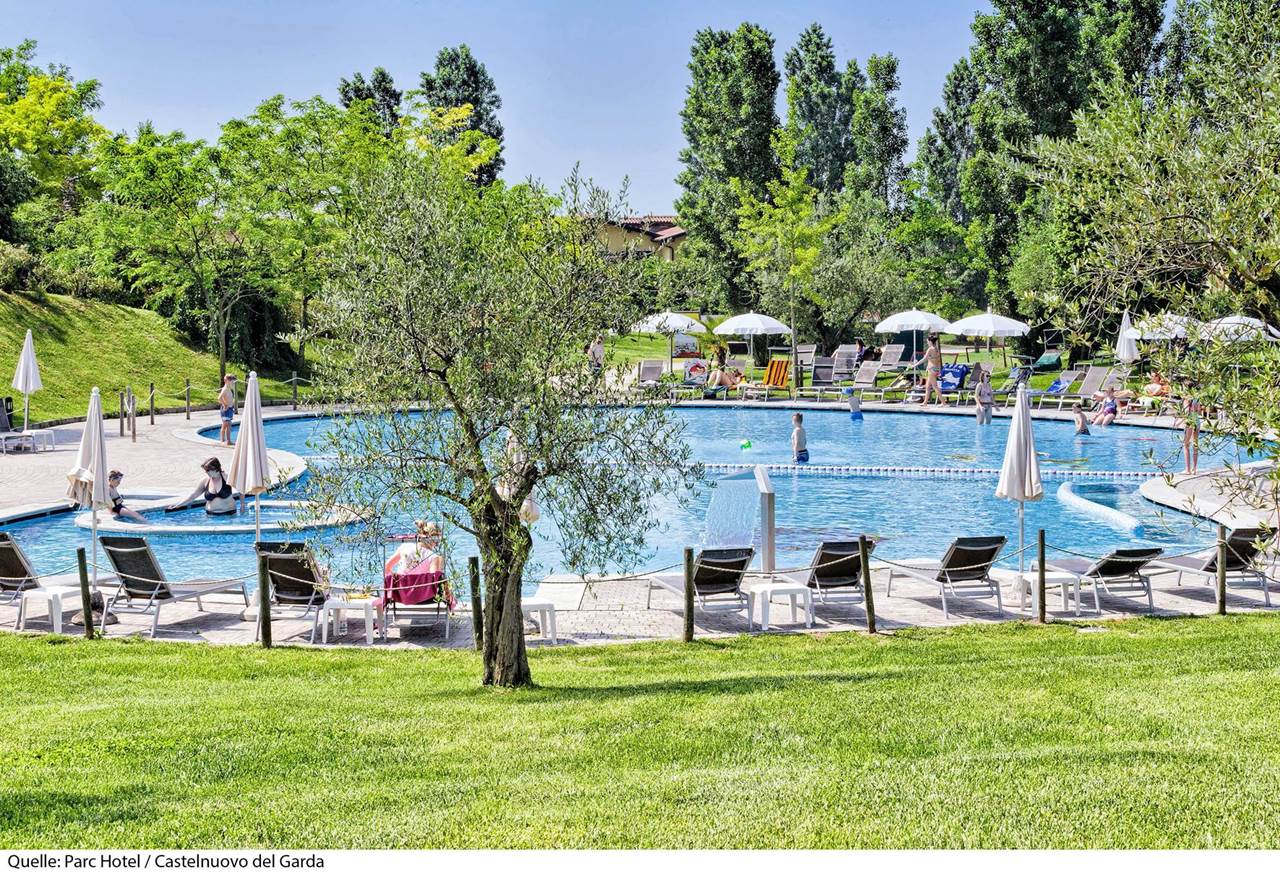 Il Parc Hotel 4* si trova a 2 km dal centro di Peschiera del Garda. Sorge in posizione strategica tra Verona e il Lago di Garda ed è il punto di partenza ideale per numerose località circostanti ricche di ville, castelli e vigneti. La stazione ferroviaria dista 2 km, l'aeroporto di Verona 31 km ed a soli 5 km, nel comune di Castelnuovo del Garda, si trova il parco divertimenti n° 1 in Italia, Gardaland. La struttura dispone di reception, bar, ristorante, palestra (gratuita), campo da tennis (a pagamento), campo da golf (a pagamento), biliardo e calcio balilla (gratuiti, dal 10/06/26 al 31/08/26), deposito biciclette non custodito, noleggio biciclette (a pagamento), servizio navetta da/per il Lungolago Mazzini a Peschiera (gratuito, da marzo ad ottobre), Junior Club (gratuito, da 12 a 16 anni, dal 10/06/26 al 31/08/26), Mini Club (gratuito, da 4 a 11 anni, dal 10/06/26 al 31/08/26), programma d'animazione serale (dal 10/06/26 al 31/08/26), 1 biglietto per persona per Gardaland (gratuito, solo per soggiorni di minimo 7 notti dal 04/07/26 al 30/08/26), parcheggio (gratuito, secondo disponibilità), garage (gratuito, secondo disponibilità) e Wi-Fi (gratuito). Le camere dispongono di balcone o patio, servizi privati, aria condizionata (gratuita), riscaldamento, cassaforte (gratuita), asciugacapelli, minibar (a pagamento), telefono, Tv e Wi-Fi (gratuito). Tutte le camere sono di 18 mq.