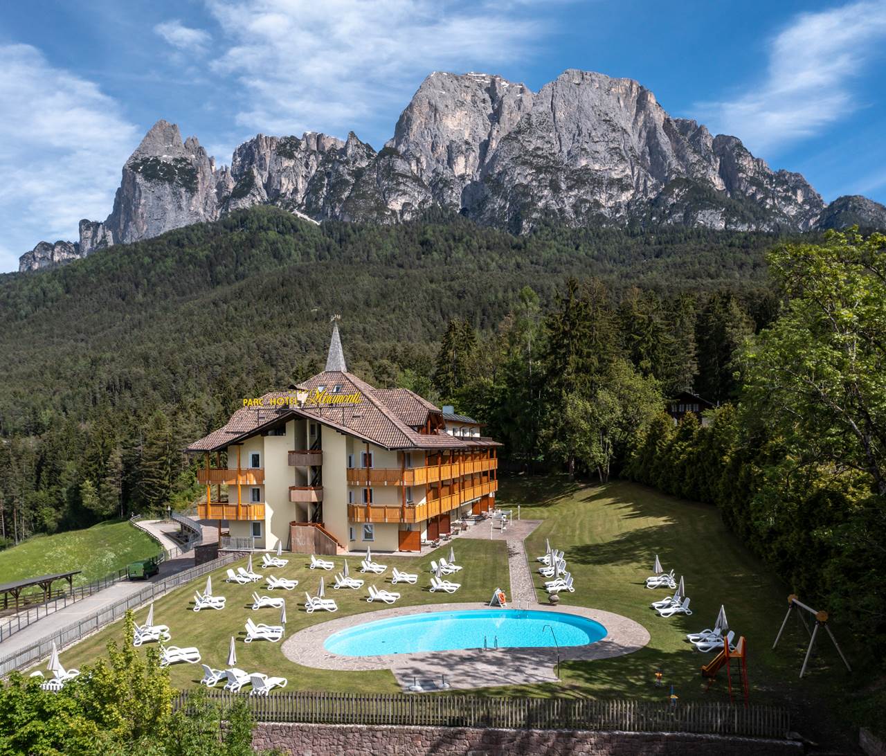 Il Parc Hotel Miramonti 4* è situato nel verde, a 3 km dall'abitato di Siusi, a 3,5 km dal paese di Fiè allo Scilar e a 1,5 km dalle piste da sci. È immerso nella fantastica cornice dell'Alpe di Siusi, l'altopiano più grande d'Europa, e circondato dal maestoso panorama naturale delle Dolomiti. Un'atmosfera familiare di cordialità e gentilezza, con camere arredate con cura e dotate di ogni comfort e una cucina contemporanea e allo stesso tempo tipica dell'Altopiano dello Sciliar. La struttura dista 3 km dal centro, la fermata dei mezzi pubblici si trova a 50 metri e l'aeroporto e la stazione ferroviaria di Bolzano sono a 20 km di distanza. La struttura dispone di reception, deposito bagagli, sala lettura, ascensore, ristorante, bar, terrazza, giardino attrezzato con ombrelloni e sedie a sdraio (gratuiti, secondo disponibilità), palestra (gratuita), deposito sci, biliardo (a pagamento), parco e sala giochi per bambini, parcheggio (gratuito, su richiesta, secondo disponibilità), garage (a pagamento, secondo disponibilità) e Wi-Fi (gratuito). Le camere dispongono di balcone o terrazza, servizi privati, asciugacapelli, accappatoio (solo nelle Camere doppie Economy e quadruple Deluxe, gratuito), riscaldamento, minibar (a pagamento), cassaforte (gratuita), telefono, Tv e Wi-Fi (gratuito). Le Camere doppie Economy sono di 20 mq, le Camere doppie Superior sono di 24 mq mentre le Camere quadruple Deluxe sono di 27 mq.