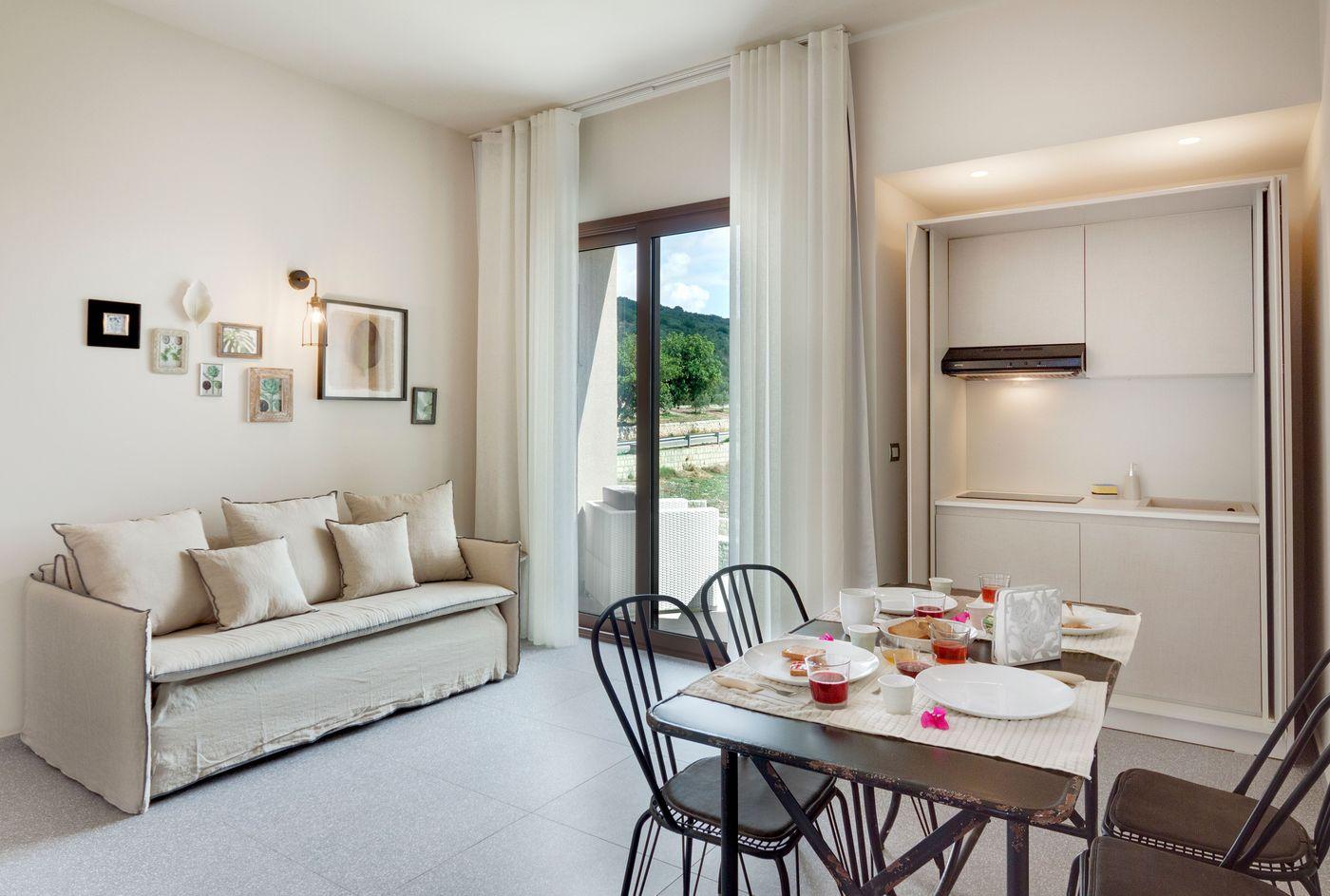 L'ampia area living offre un ulteriore spazio per il relax, con un comodo divano letto e un pratico piano cottura. La camera da letto principale, incredibilmente spaziosa, vanta un lussuoso letto matrimoniale e un bagno privato.