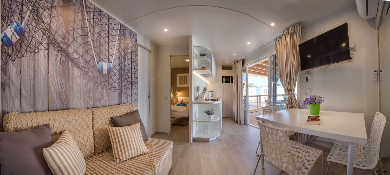 sistemazione in casa mobile, biancheria e asciugamani da bagno, elettricità, acqua e aria condizionata, Wifi, culla (su richiesta), utilizzo della piscina esterna riscaldata d'acqua dolce per adulti e bambini (in base alle condizioni meteo), animazione e miniclub (1 luglio-1 settembre), parcheggio.La quota non comprende