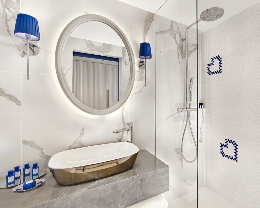 Camera Collection: letto king-size, bagno con doccia, asciugacapelli e prodotti lussuosi per il bagno. Servizi: internet superveloce, TV smart a schermo piatto da 55 pollici, telefono con linea diretta, cassaforte per computer portatile, macchina per caffè espresso ILLY, minifrigo, kit con accappatoio e ciabattine, ferro ed asse da stiro (su richiesta). 23 mq.Spiaggia