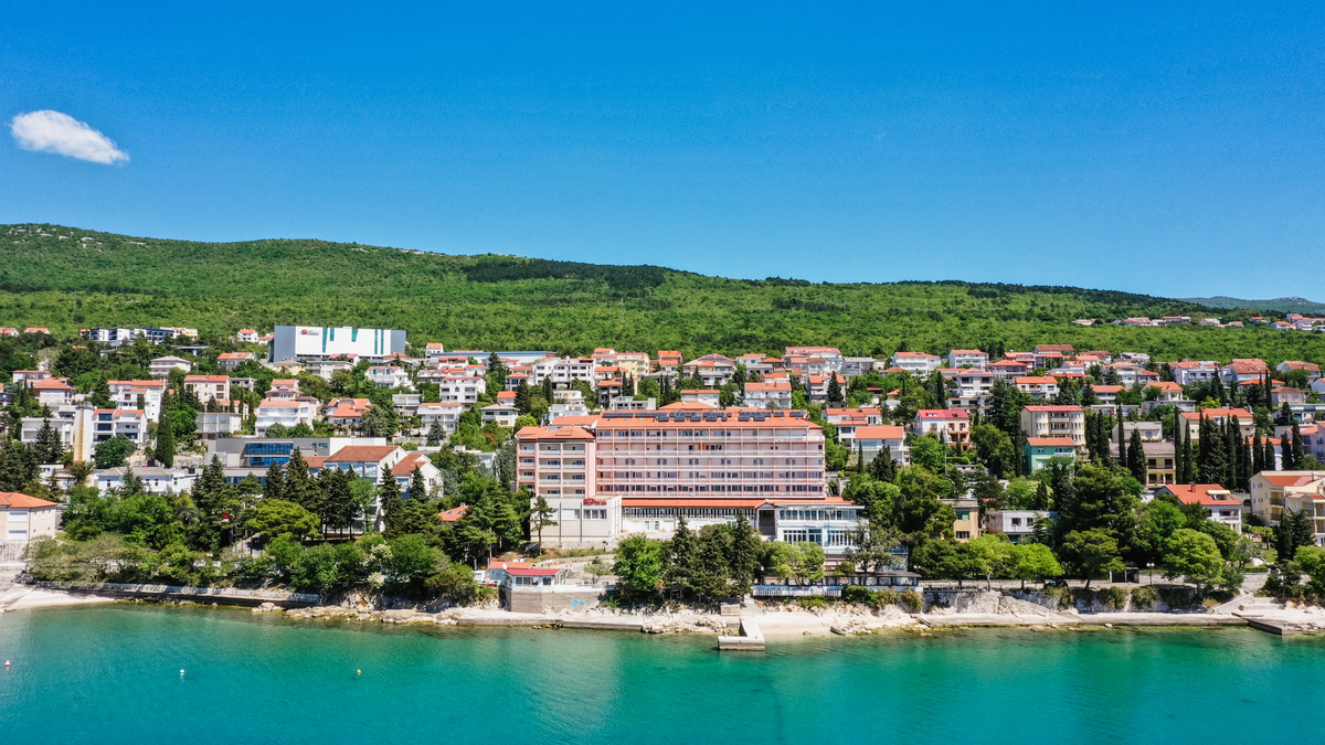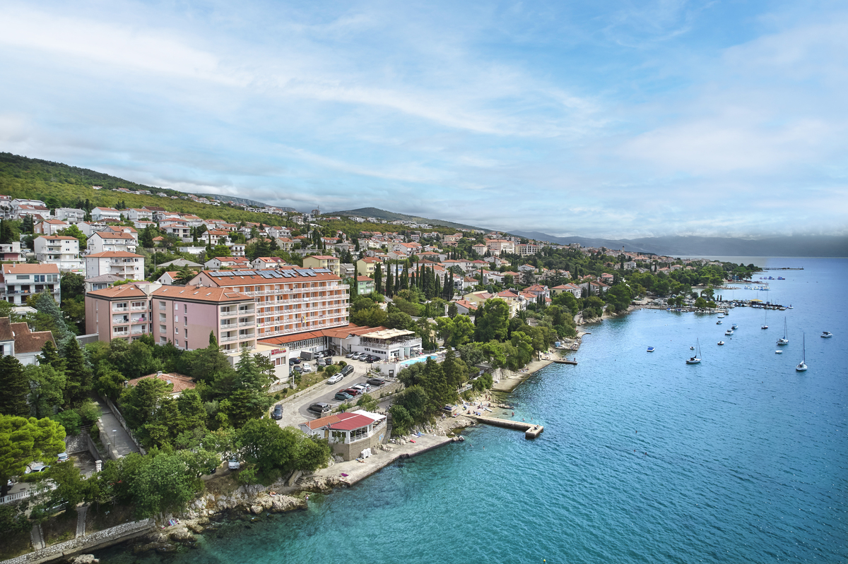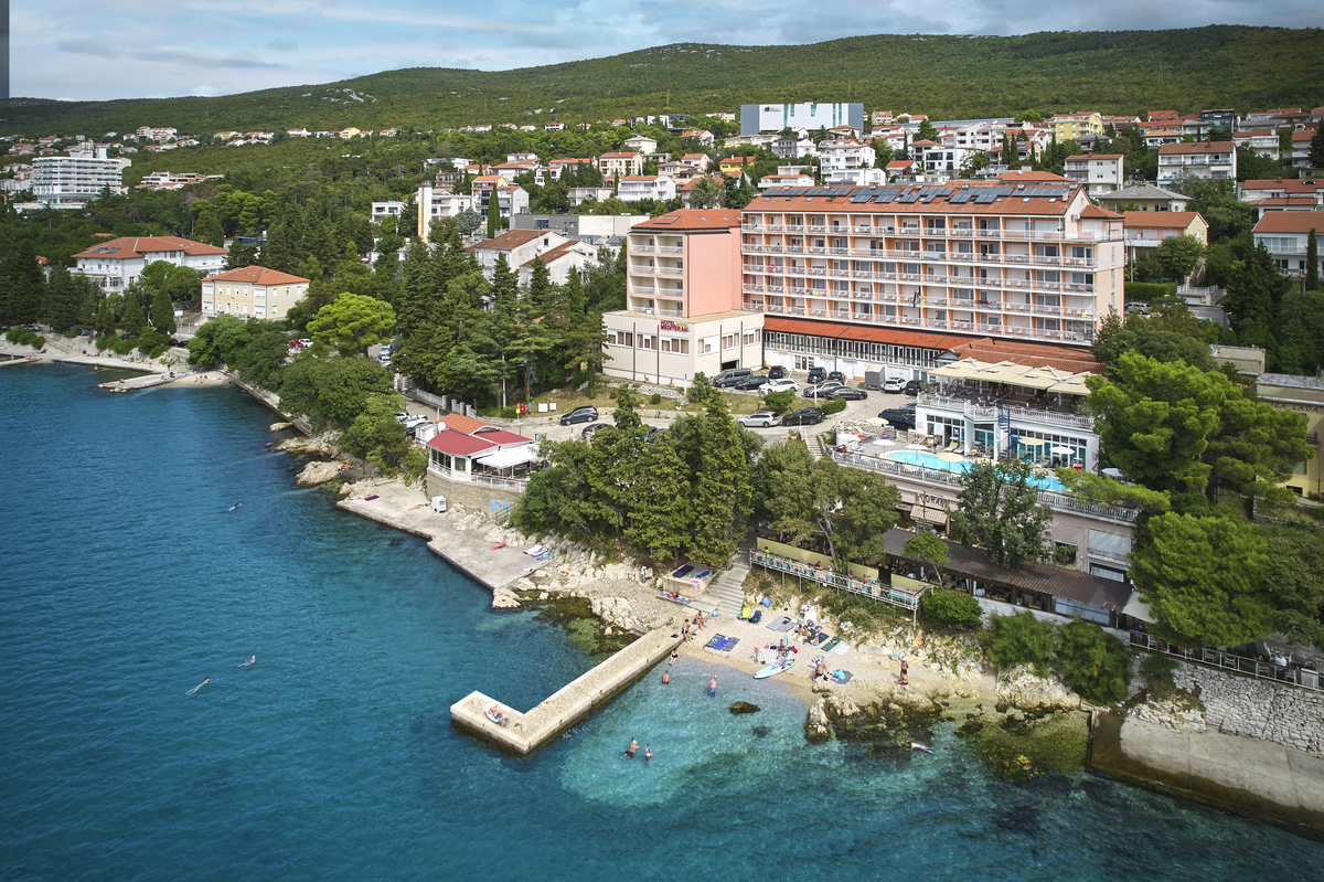 Sotto l'hotel, troverete una spiaggia di ciottoli con aree prendisole in cemento, una bellezza incorniciata da pini. Di fronte a voi, il mare cristallino e l'isola di Krk in lontananza. A 50 metri dall'hotel spiaggia di ciottoli con zone in cemento lettini e ombrelloni (a pagamento) servizio asciugamani (a pagamento) ristorante e bar animali ammessi solo a Monty's Dog BeachAmici a 4 Zampe