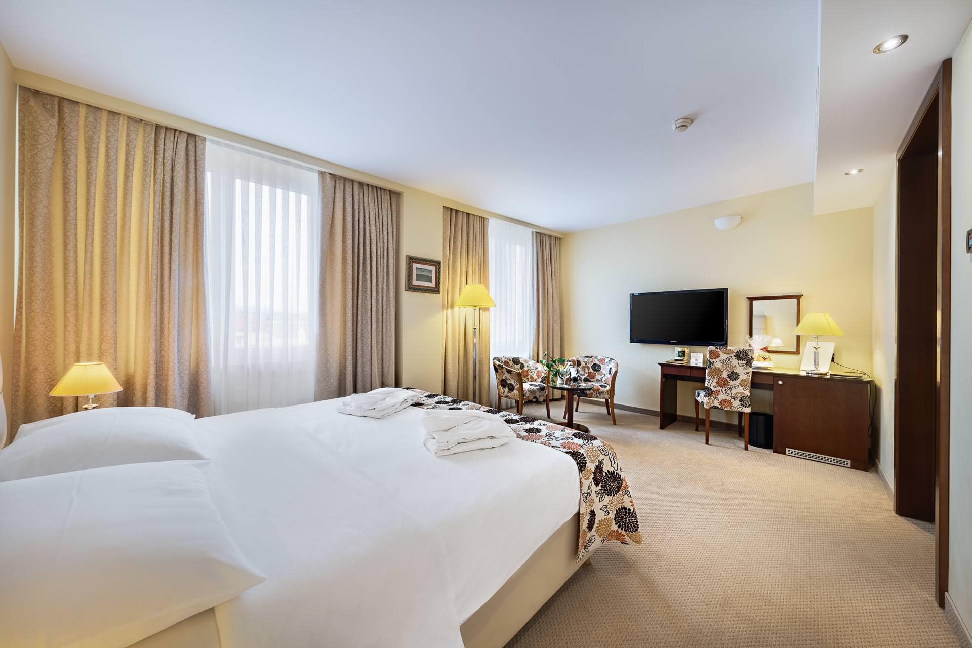 214 camere e 8 suite progettate per il massimo comfort e funzionalità. Camera Standard: letto matrimoniale o due letti singoli, bagno con vasca, asciugacapelli, set di cortesia standard, accappatoio, pantofole, aria condizionata, riscaldamento, telefono, TV satellitare, Wi-Fi, minibar, cassaforte. 24,50-30 mq. Camera Deluxe: letto matrimoniale o due letti singoli, bagno con vasca, asciugacapelli, set di cortesia standard, accappatoio, pantofole, aria condizionata, riscaldamento, telefono, TV satellitare, Wi-Fi, minibar, cassaforte. 30-32 mq.Amici a 4 Zampe