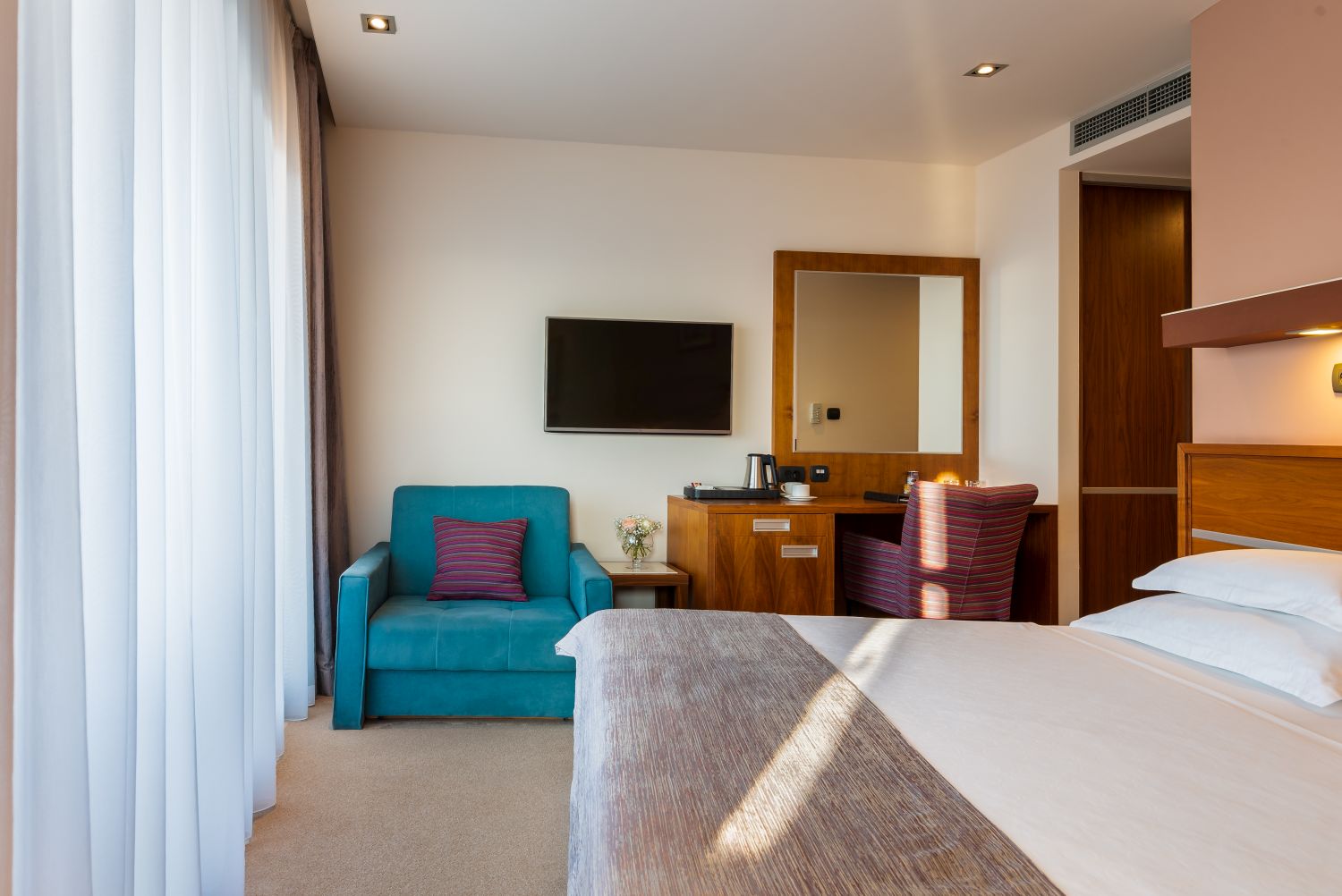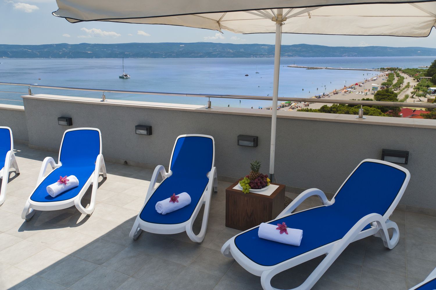 Camera Classic: bagno con vasca, asciugacapelli, accappatoio e pantofole, aria condizionata, telefono, Smart TV, minibar, bollitore, cassaforte. Lato strada, senza balcone. Camera Superior: bagno con vasca, asciugacapelli, accappatoio e pantofole, aria condizionata, telefono, Smart TV, minibar, bollitore, cassaforte, balcone lato mare. Camera Premium: bagno con vasca, asciugacapelli, accappatoio e pantofole, aria condizionata, telefono, Smart TV, minibar, bollitore, cassaforte, balcone con vista sul Mar Adriatico e sull'isola di Brac.Amici a 4 Zampe