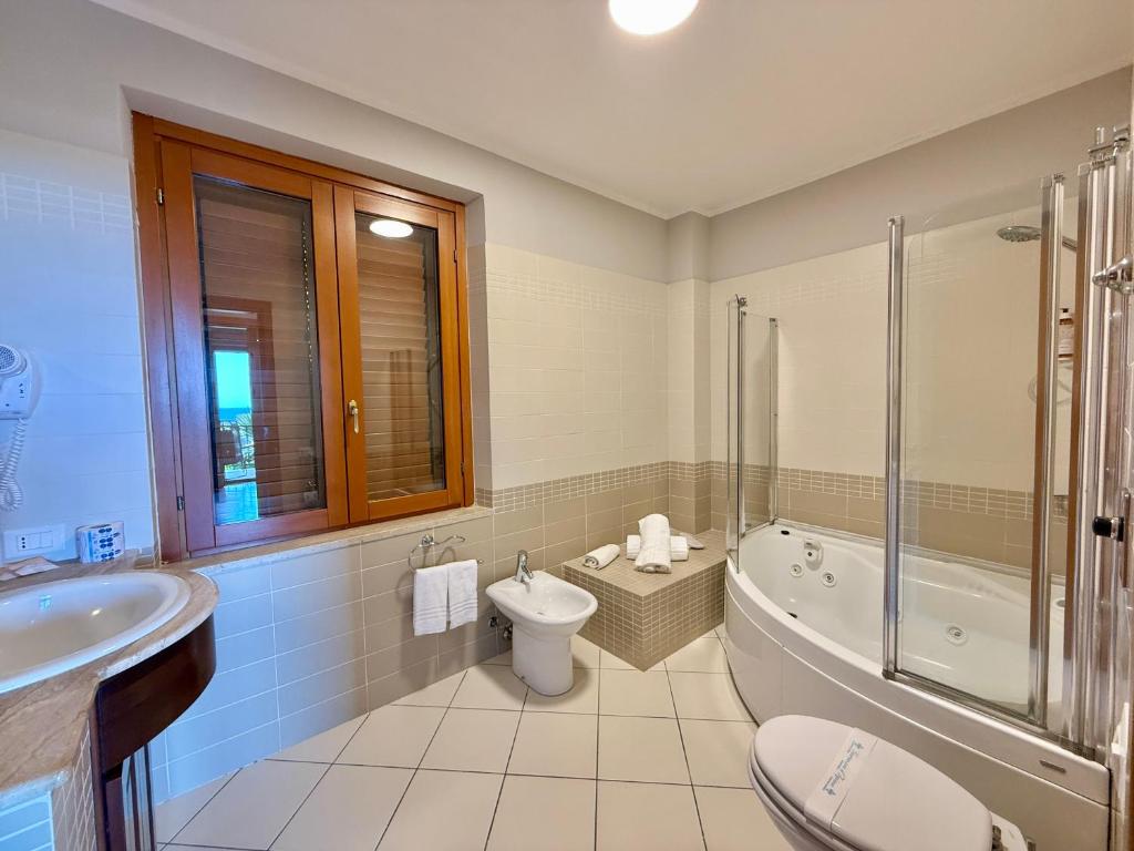 Animali ammessi solo nelle camere Basic e Standard Vista Mare – massimo 10 kg – €30 al giorno (inclusi kit ciotole e pulizia).Culla €10 al giorno, su richiesta; Navetta da/per la spiaggia, spiaggia convenzionata, noleggio teli mare.Da sapere