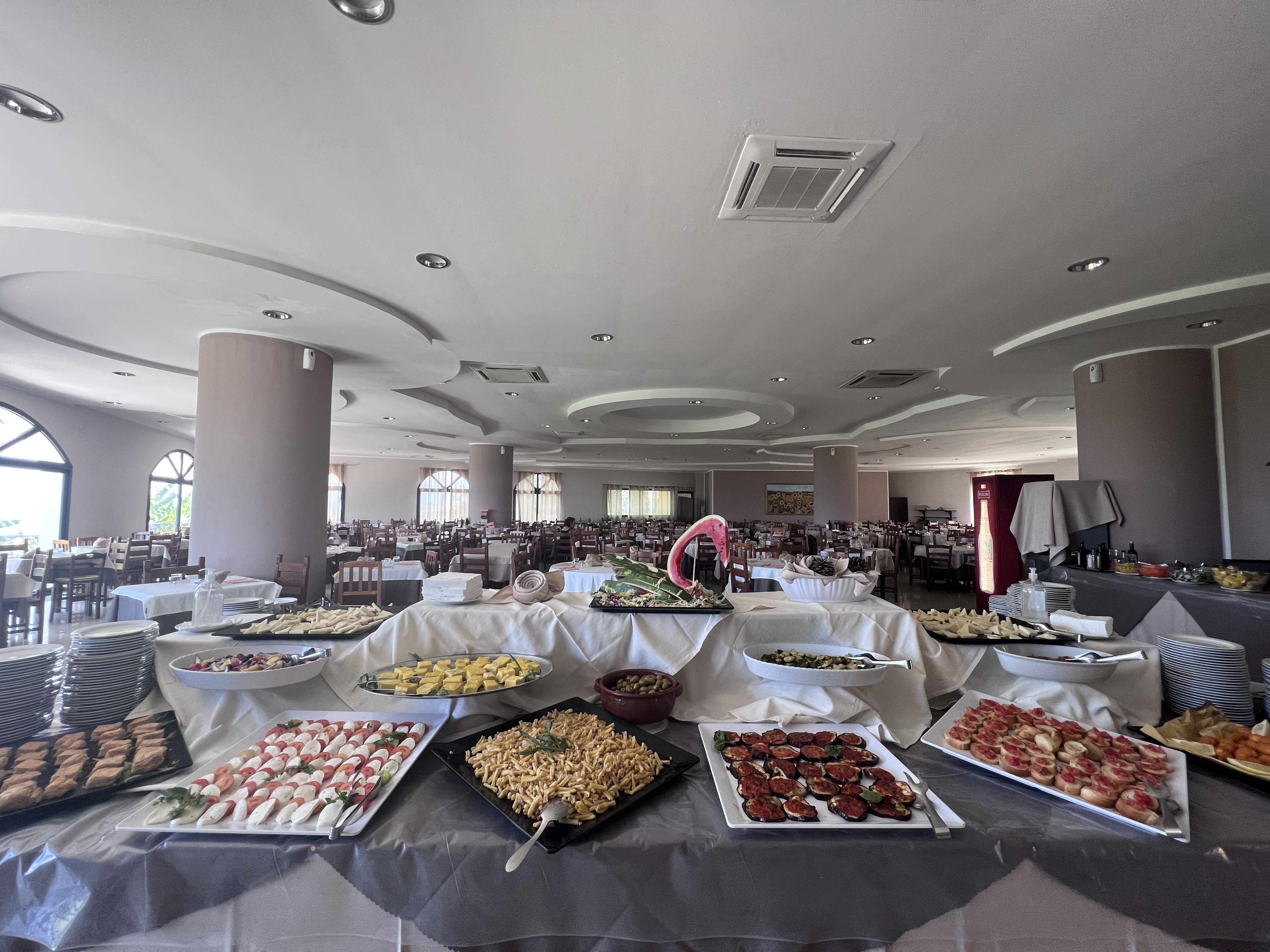 * Soft All Inclusive con colazione (07:30 – 09:30), pranzo (12:30 – 14:00) e cena (19:30 – 21:00) con tavolo preassegnato ed eventuale riempimento con altre persone e servizio a buffet (con menu a base di carne e pesce con antipasti vari, insalate, verdure e contorni; 3 primi piatti - a cena anche 1 zuppa - 2 secondi, frutta a pranzo e dolce a cena; a discrezione della Direzione possibilità di doppi turni per il pranzo - 1° turno 12:20-13:20 e 2° turno 13:30-14:30, e la cena - 1° turno 19:20-20:20 e 2° turno 20:30-21:30; il soggiorno inizia con la cena e termina con la colazione), bevande ai pasti (acqua microfiltrata naturale e frizzante in caraffa, vino della casa in caraffa, soft drink alla spina, birra alla spina), bevande presso il bar centrale (dalle 09:30 alle 21:30) e presso il bar spiaggia (dalle 09:30 alle 18:00) con soft drink/bevande analcoliche alla spina (acqua microfiltrata, cola, aranciata, acqua tonica, succhi di frutta)