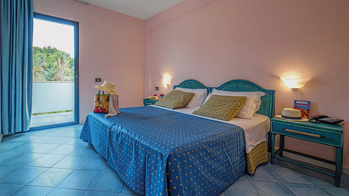 Le camere dispongono di servizi privati con doccia/vasca, aria condizionata, telefono, frigobar (su richiesta consumazioni da pagare in loco), Tv, Wi-Fi gratuito, cassetta di sicurezza, balcone o patio. Si distinguono in camere Standard (occupazione massima 3 adulti + 1 infant fino a 3 anni non compiuti) e camere Family (occupazione massima 4 adulti) composte da camera matrimoniale e cameretta con due letti piani. Su richiesta al call center: camere per disabili, camere singole (supplemento 25% - non disponibili dal 02/08/2026 al 30/08/2026).