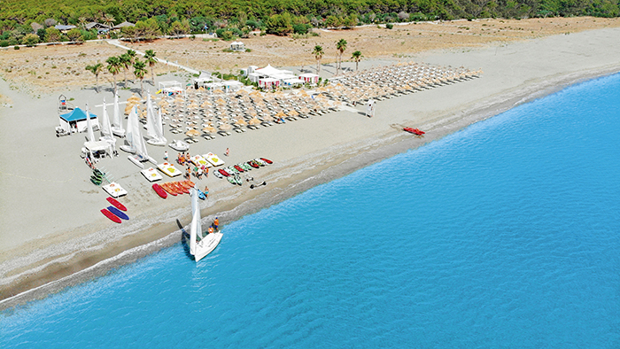 La spiaggia privata del complesso turistico dista circa 200 metri. dalla zona centrale del villaggio, di sabbia con ghiaia sul bagnasciuga. La spiaggia è raggiungibile a piedi percorrendo una pineta che porta al mare. Il servizio spiaggia è incluso nella Tessera Club e comprende 1 ombrellone e 2 lettini a camera dalla 3° fila.