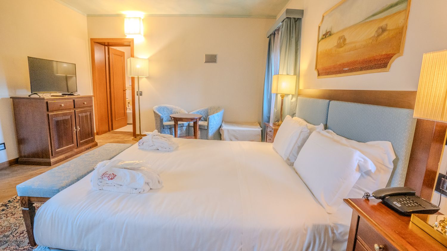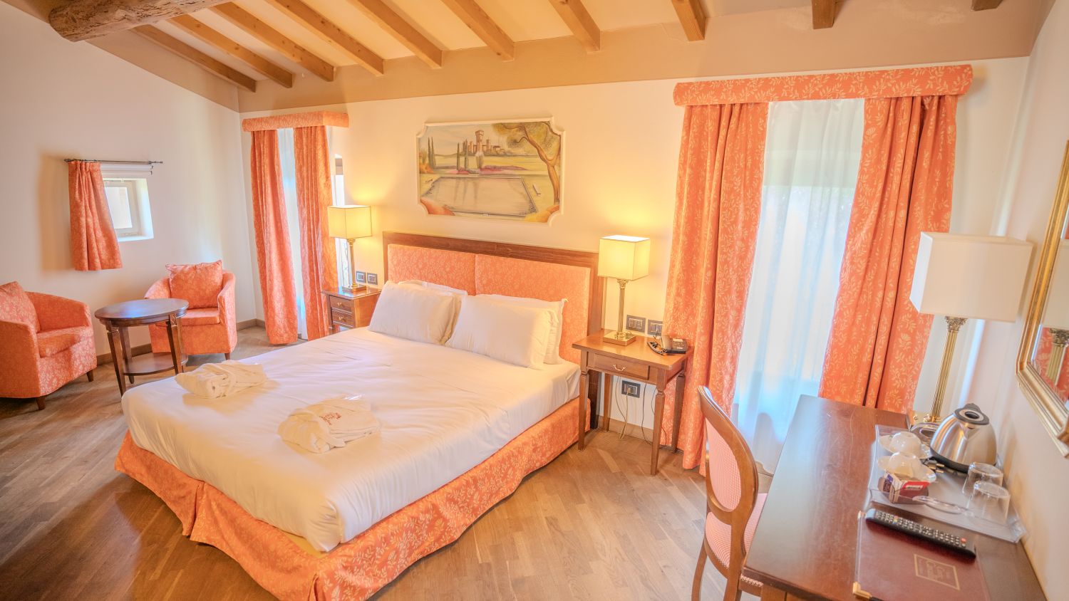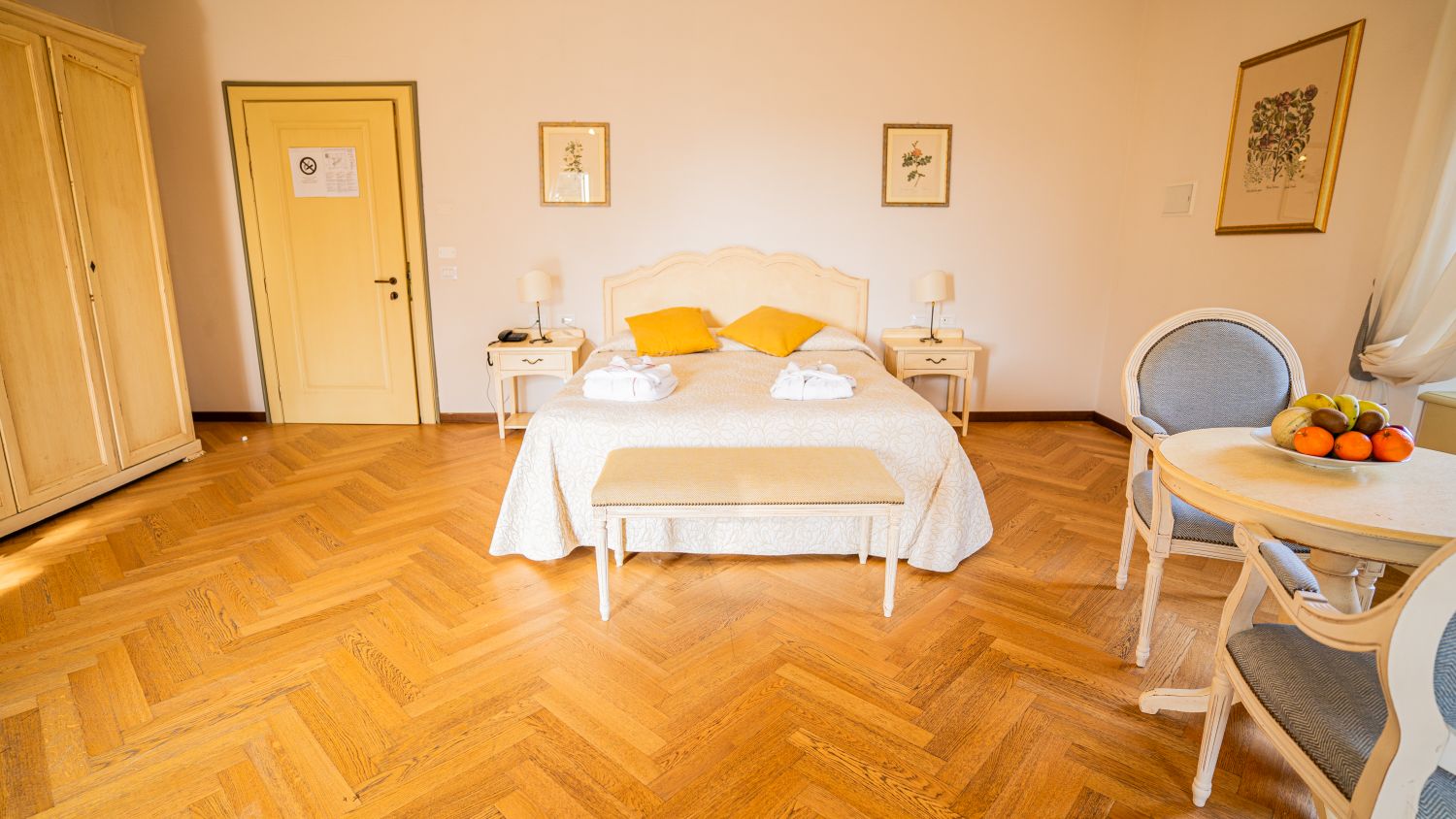Le camere si presentano con arredi di lusso e soffitti con travi a vista, combinano stili rustici ed eleganti. Ognuna è dotata di TV LCD satellitare e minibar, e alcune sono decorate con affreschi.Amici a 4 Zampe