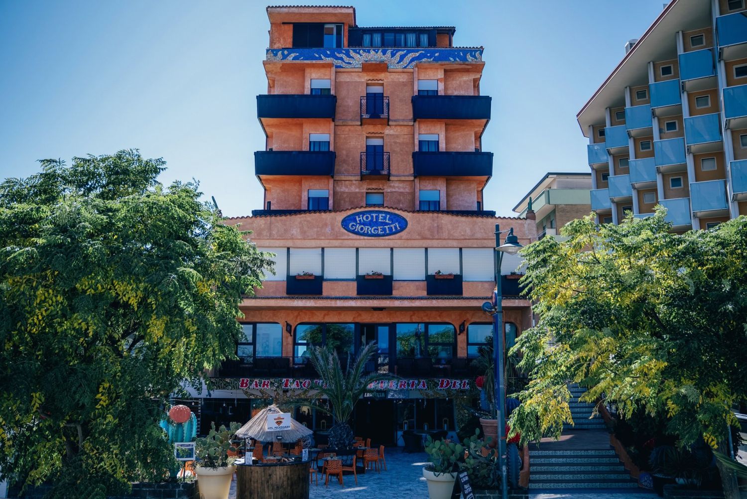L'hotel, una struttura di 8 piani affacciata sulla splendida spiaggia di Bellaria, offre ampi spazi comuni ideali per il relax, oltre alla possibilità di ospitare convention e riunioni per gruppi numerosi. Al piano terra, il nostro locale messicano è il luogo perfetto per gustare cocktail e tacos. Costruito nel 1964 dalla famiglia Giorgetti, l'hotel è un pezzo della storia turistica di Bellaria, riconosciuto negli anni '70. Ogni camera offre una vista meravigliosa, ampi spazi, luce naturale, e comfort come pale a soffitto e TV via cavo. L'aria condizionata è disponibile come servizio extra. L'hotel si trova fronte mare, a soli 150 metri dal centro del paese, ed è la scelta ideale per una vacanza perfetta sulla riviera romagnolaSistemazioni