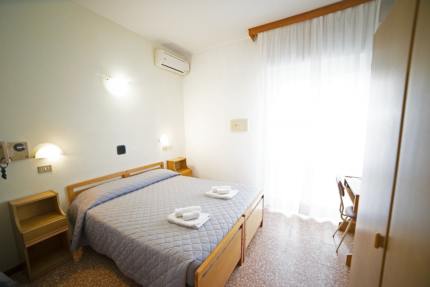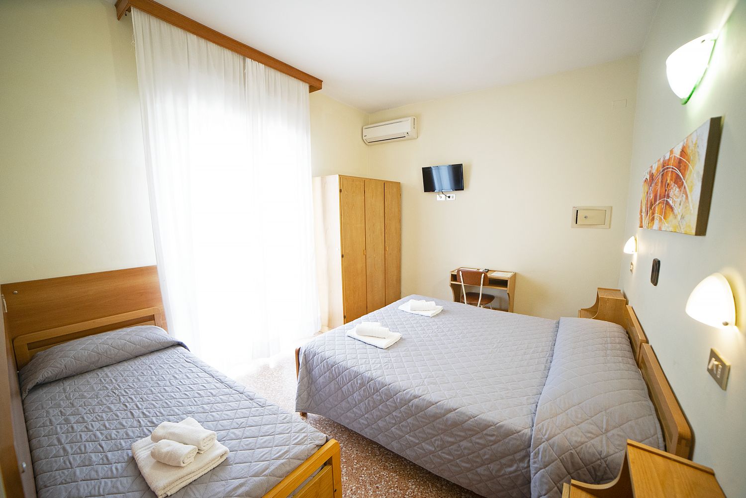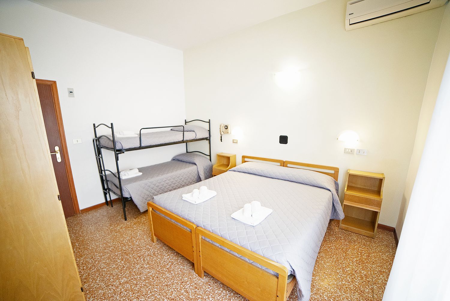 Le camere, semplici ma confortevoli, sono dotate di: bagno privato con doccia e asciugacapelli, bidet (tranne le singole), aria condizionata (a pagamento), smart TV 24", Wifi, cassaforte, balcone. Minibar su richiesta, con supplemento.Spiaggia