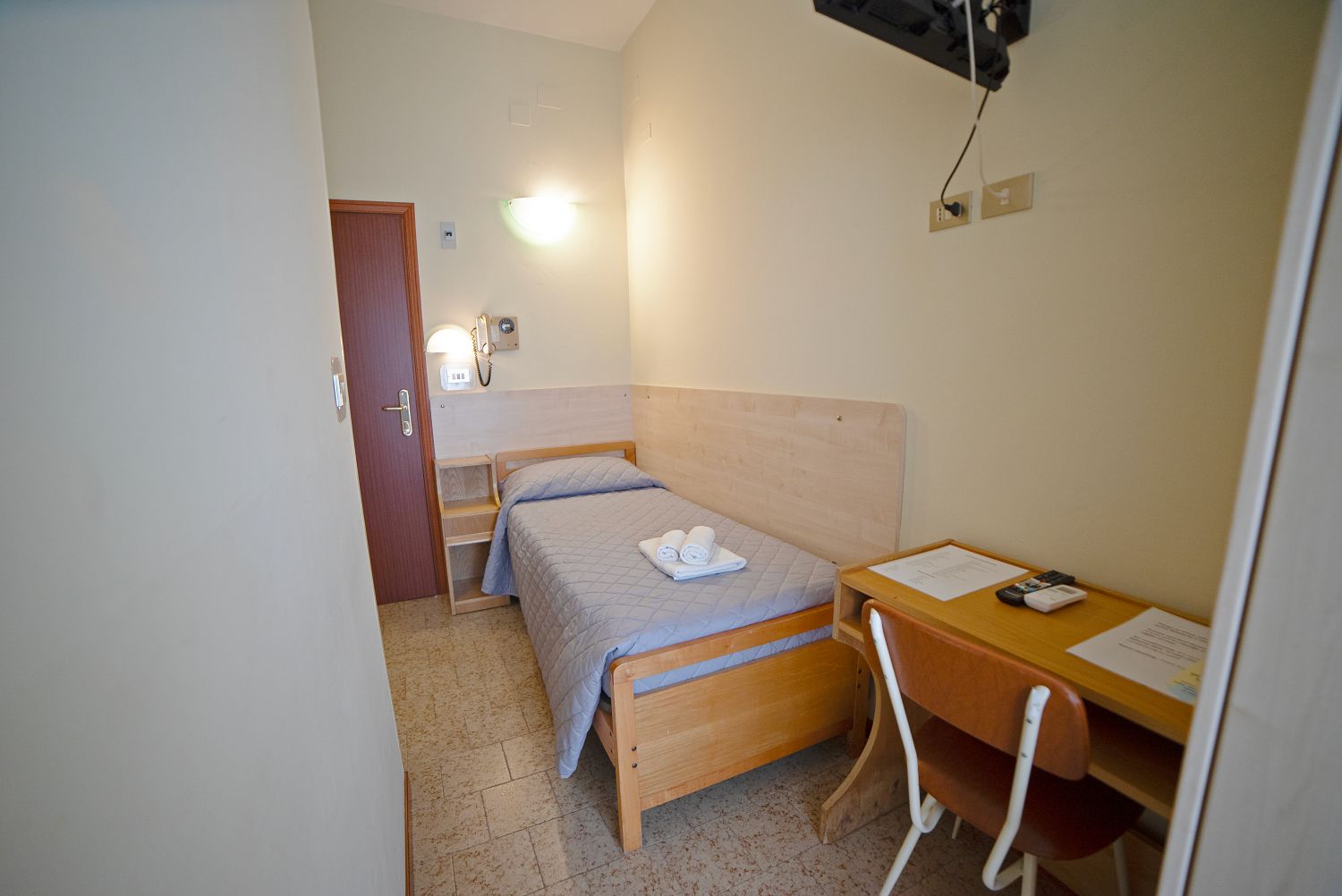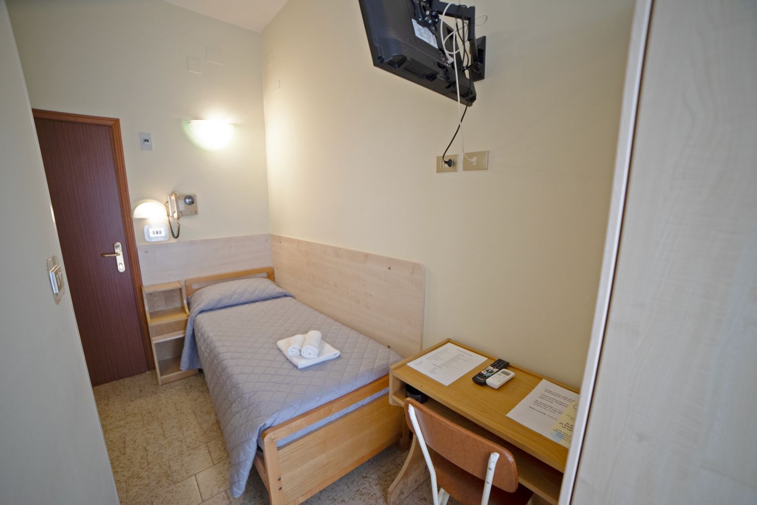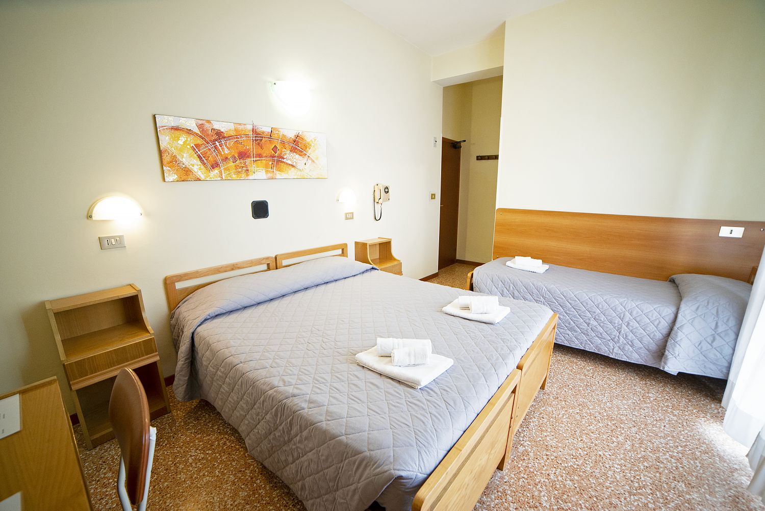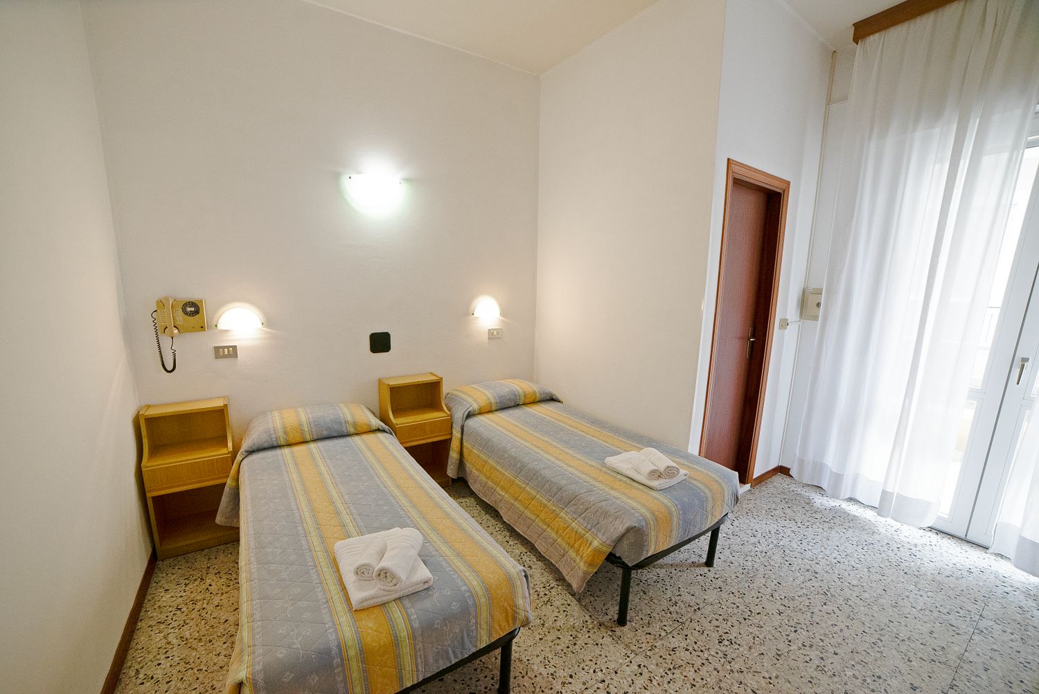 Le camere, semplici ma confortevoli, sono dotate di: bagno privato con doccia e asciugacapelli, bidet (tranne le singole), aria condizionata (a pagamento), smart TV 24", Wifi, cassaforte, balcone. Minibar su richiesta, con supplemento.Spiaggia