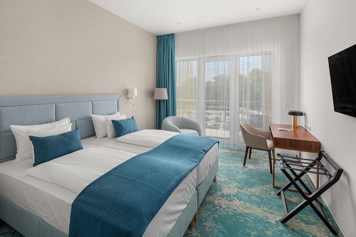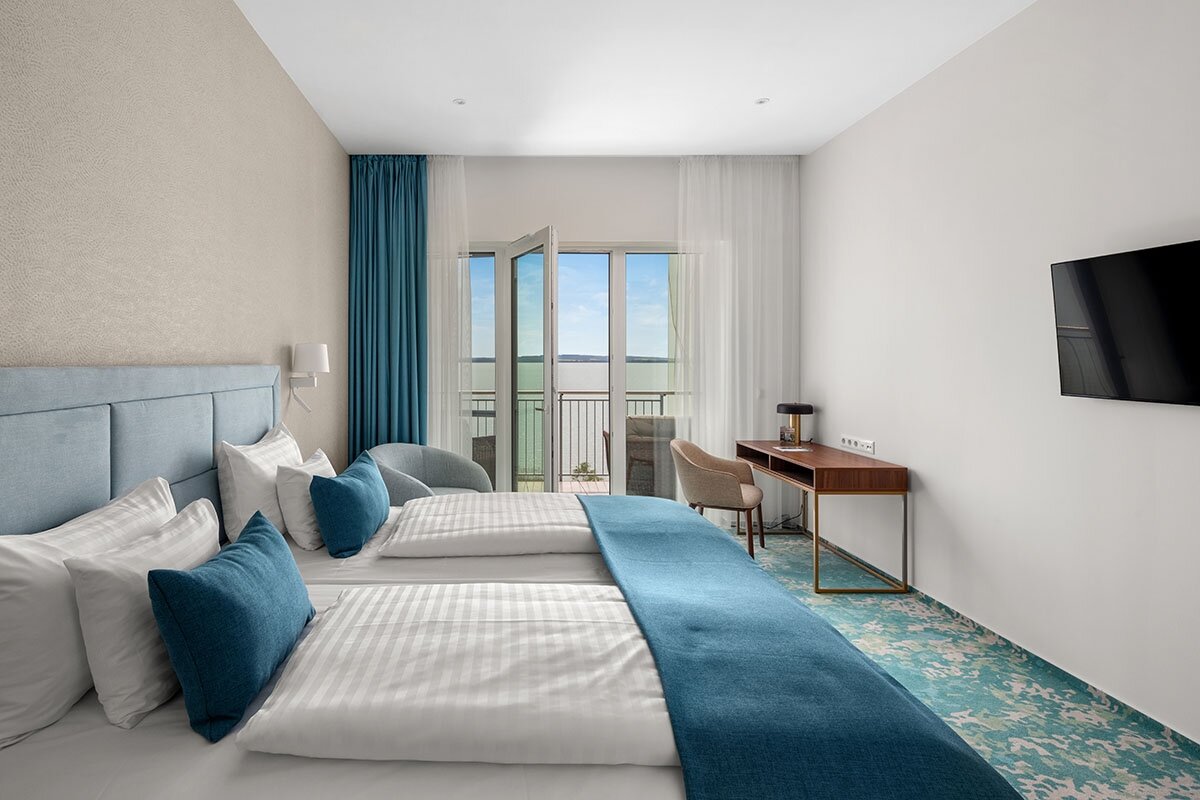 L'hotel offre 128 camere elegantemente arredate con colori piacevoli. Le diverse tipologie di camere garantiscono a tutti di trovare quella più adatta alle proprie esigenze. Nella nostra offerta troverete le camere LakeSide con comode terrazze, panorama infinito e vista sul Lago Balaton, le camere ParkSide con terrazza e vista sul parcheggio, e suite di varie dimensioni come la Junior Suite e la Suite Orion. Consigliamo le nostre camere comunicanti con porte comunicanti per famiglie e gruppi di amici. Camera doppia lato parco: spaziose camere doppie dal design moderno con terrazza ciascuna e vista sul parcheggio. 23 mq, con 2 letti da 200x100 cm. Camera doppia lato lago: spaziose camere doppie dal design moderno con terrazza ciascuna e vista sul Lago Balaton, per ospitare due adulti e un bambino. 23 mq, con 2 letti da 200x100 cm, letto aggiuntivo su richiesta.Amici a 4 Zampe
