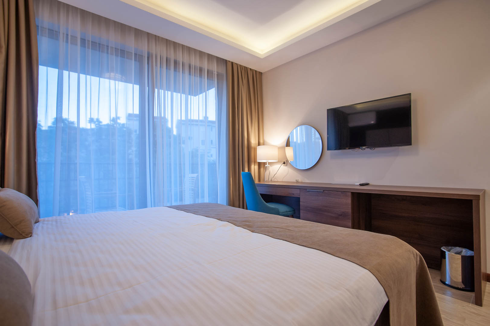 Camera doppia standard: letto matrimoniale (180x200) o due letti singoli (90x200), bagno (doccia, WC, asciugacapelli, pantofole), aria condizionata, telefono con linea diretta, TV satellitare, Wi-Fi, minibar, cassaforte, balcone. 21 m2, vista sulla città. Camera doppia standard con letto aggiunto: letto matrimoniale (180x200) e divano letto per 1 persona, bagno (doccia, WC, asciugacapelli, pantofole), aria condizionata, telefono con linea diretta, TV satellitare, Wi-Fi, minibar, cassaforte, balcone. 26 m2, vista sulla città.Amici a 4 Zampe