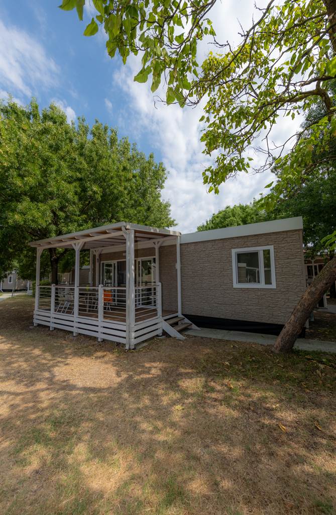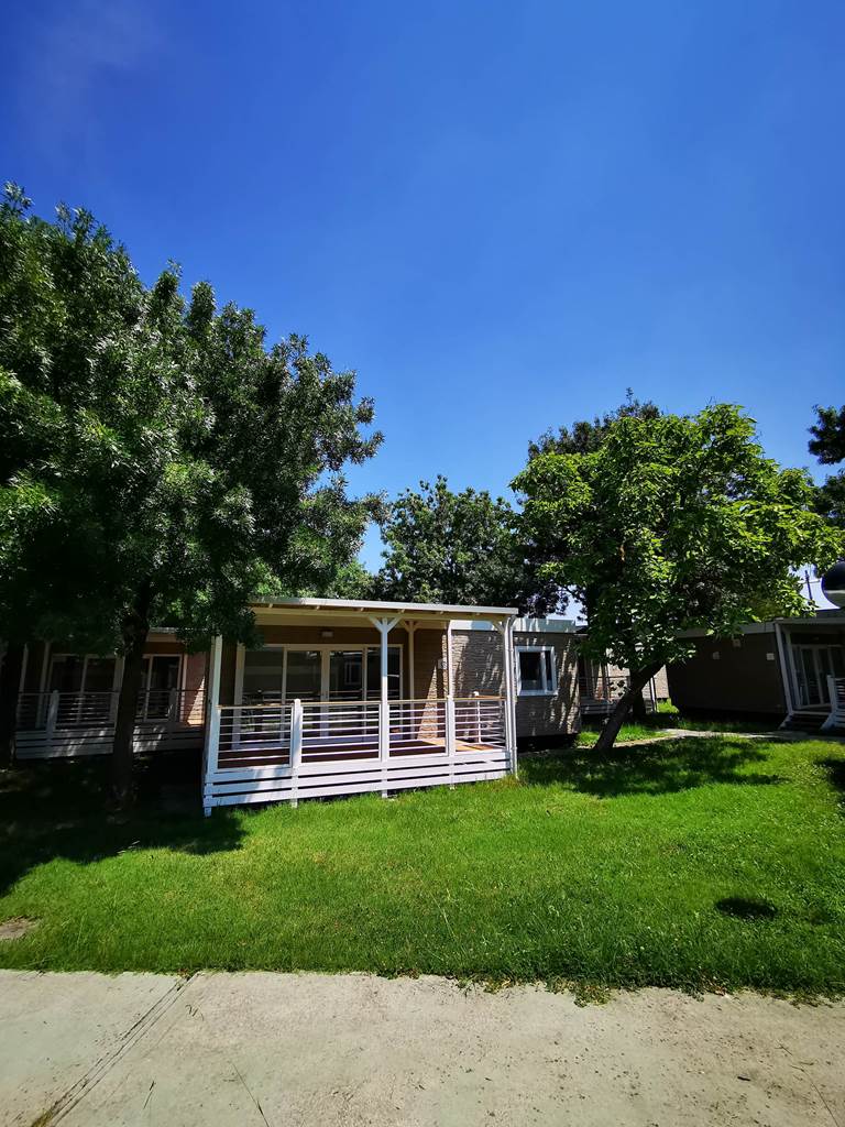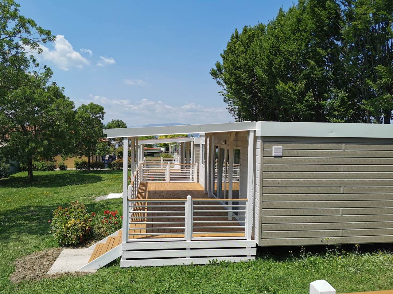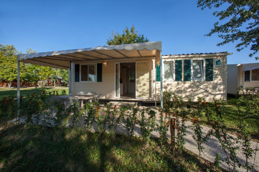 Z1 Maxi Caravan: 33mq ca. Camera da letto con letto matrimoniale, 2 camere da letto con due letti singoli, angolo cottura e frigorifero, bagno con doccia, terrazzo coperto (10-15 m²) sul giardino con tavolo e sedie, aria condizionata (caldo/freddo), TV, stoviglie per 6 persone, microonde, parcheggio privato.