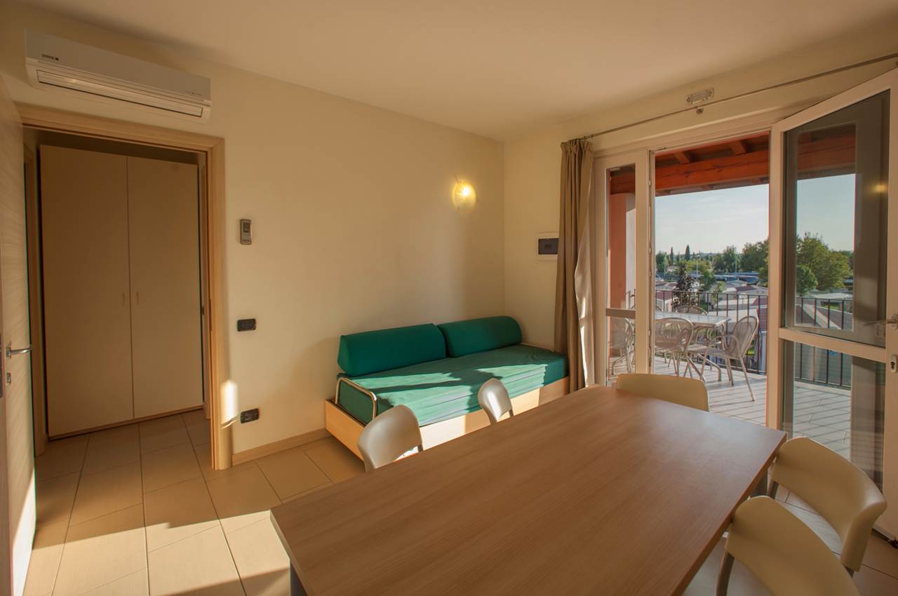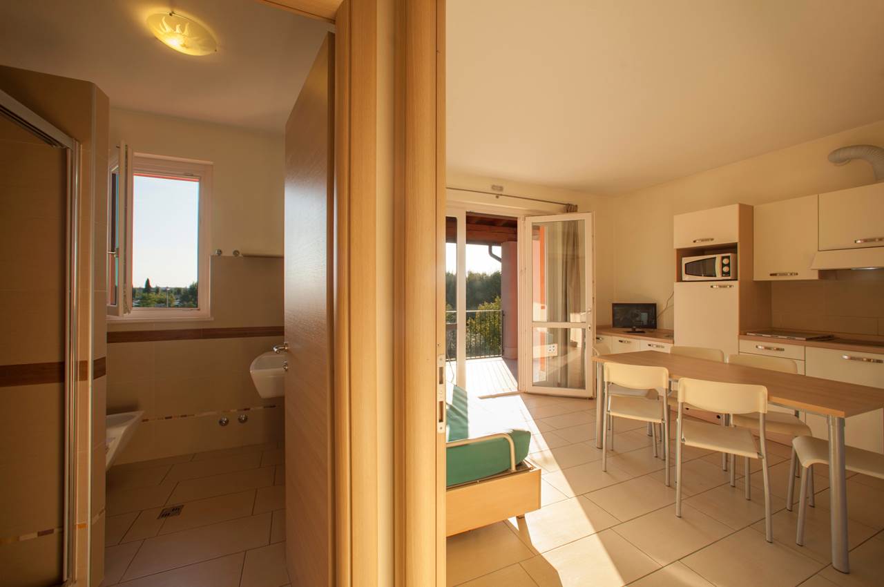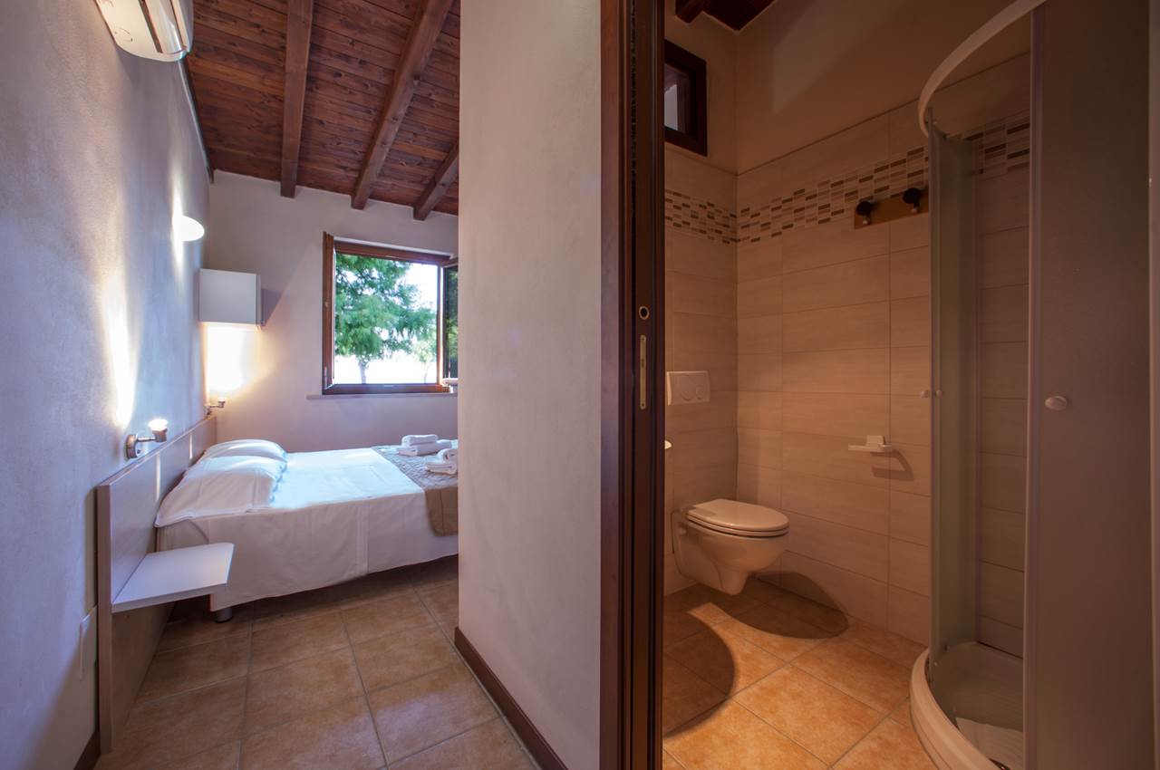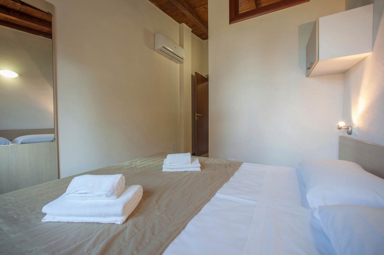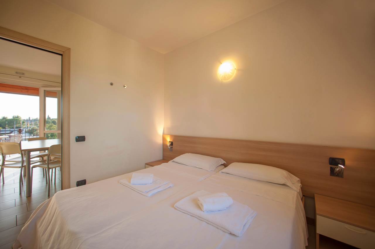 TRICO: Trilo Comfort: 45/50mq ca. (max 4+2) . Camera da letto con letto matrimoniale, camera da letto con 2 letti singoli o 1 letto a castello, soggiorno con letto a castello, angolo cottura e frigorifero, bagno con doccia, terrazzo coperto (10-15 m²) sul giardino con tavolo e sedie, posto auto privato, aria condizionata (caldo/freddo), TV, stoviglie per 6 persone, microonde.