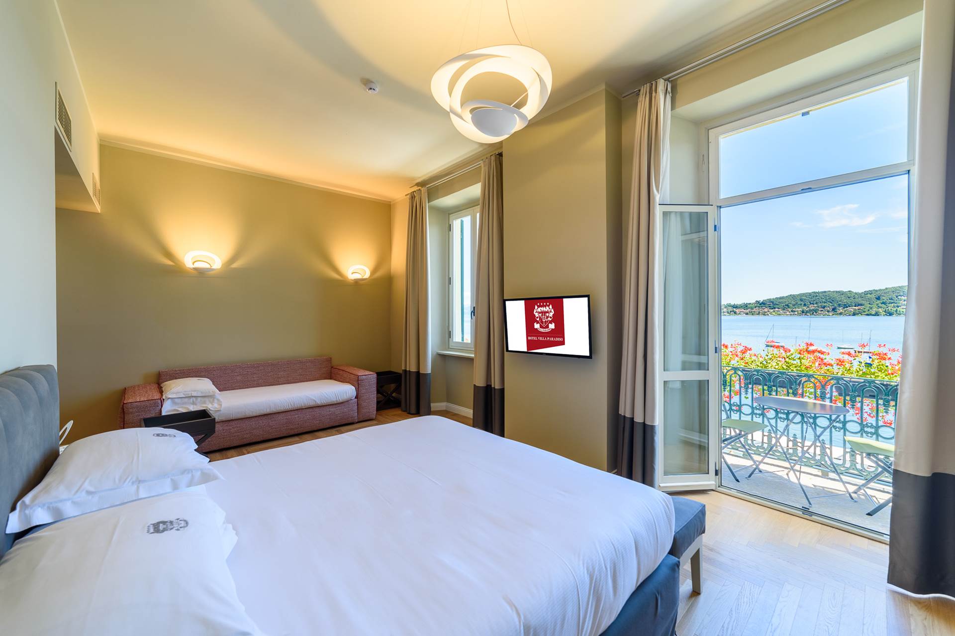 J2 Junior Suite Deluxe Vista Lago: 30mq ca. Doccia/WC, asciugacapelli, accappatoio, telefono, TV satellitare, cassaforte, ciabattine, bollitore per caffè/tè, mini bar, wifi gratuito, pavimento parquet, vista lago